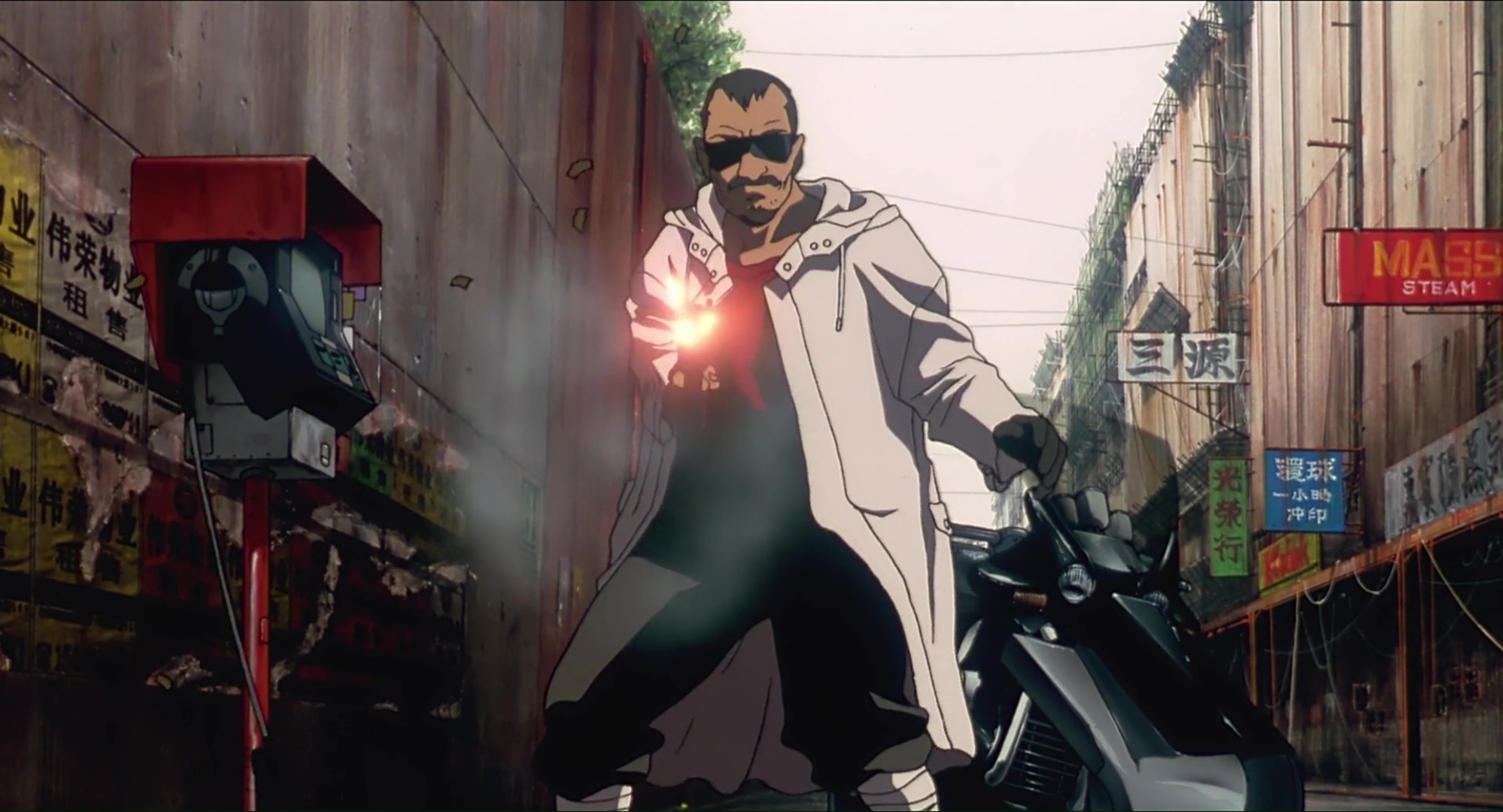 Ghost in the Shell nous raconte donc, dans les très grandes lignes, la poursuite du Major et de ses collègues de la section 9 dans le Japon de 2029 pour mettre la main sur quelqu’un se faisant appeler le Puppet Master, un redoutable pirate informatique. Rajoutons à tout ça quelques complications avec de possibles complots en interne, entre la section 9 et la section 6, mais aussi la vision d’un avenir proche, maintenant encore plus proche, qui, si cela m’étonnerait que l’on atteigne ce niveau d’ici 4 ans, reste totalement plausible du fait de technologies s’incorporant dans un monde qui ressemble malgré tout toujours au notre. Et puis, il y a le Major et ses interrogations sur ce qu’elle est, de ce qu’est la conscience, d’avoir une âme. J’airais même plus loin en incluant ses nombreux moments contemplatifs, comme son sublime générique, ou bien ce moment où le Major évolue dans la ville, regardant le monde évoluer autour d’elle sans dire un mot, regardant simplement la vie suivre son cours, l’humain fonctionner et faire sa vie, sans avoir la moindre interactions avec eux. Ces moments restent pour moi les plus beaux du métrage, et la musique de Kawai Kenji y est, certes, pour beaucoup. Et il y a ses nombreux questionnements, clairement énoncés par le Major lors de ces échanges avec ces camarades, que ce soit Batou, ou Togusa, humain presque normal à 100% pour lui. Il y a tant de choses dans Ghost in the Shell, alors qu’ironiquement, il ne dure que 1h22. Là où de nos jours, certains films osent parfois avec prétention nous raconter une histoire en 3h dont les maigres intentions tiennent en seulement trois lignes, Ghost in the Shell parvient à être bien plus en une durée archi condensée, sans oublier toutefois de nous éblouir par son visuel, et de proposer en prime quelques scènes d’action, souvent violentes et sèches.