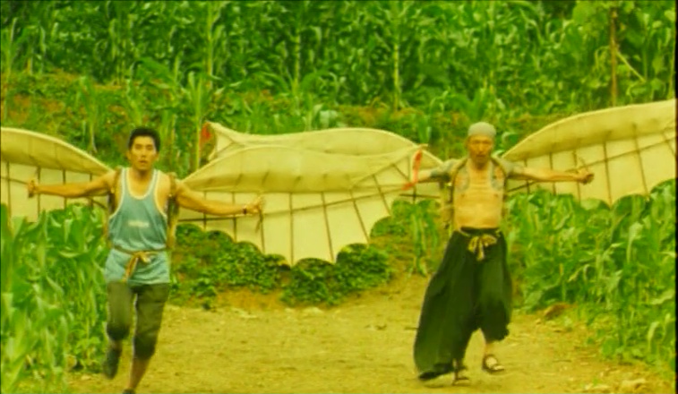 C’est cependant dans la seconde partie du métrage que le tout décolle, ce moment où nos personnages arrivent à destination et vont y rester beaucoup plus longtemps que prévu. Miike filme cette région montagneuse et pluvieuse avec simplicité, captant le mode de vie tout aussi simple des quelques habitants, et il faut souligner que son style de mise en scène, souvent à base de plans longs et de très lents travellings latéraux convient parfaitement au sujet à l’ambiance du film, poétique, mélancolique, parfois un brin surréaliste. C’est au village aussi que le titre du film prend toute sa signification, lorsque nos personnages vont croiser une jeune femme qui doit apprendre aux enfants du coin à voler, tout simplement, et que notre yakuza va se retrouver quelque peu obnubilé par l’idée. Et pas que lui. Nos personnages deviennent rêveurs, se perdent quelque peu, oublient parfois même la raison de leur venue, avant que la réalité ne les rattrape en quelque sorte, et que le doute s’installe de nouveau entre eux, car nous avons bien de base un simple salaryman, un yakuza qui veut de l’argent et un traducteur et guide qui espère enrichir son village avec la découverte de jade. Miike maitrise son sujet malgré quelques longueurs donc, habituelles de son cinéma dirons certains, et son conte initiatique se fait au final plus fin et profond que prévu, puisque Bird People in China est au final un film poétique sérieux, avec un message, bien que simpliste (laisser un lieu intact pour qu’il ne souffre pas des mêmes déconvenues que les lieux dits civilisés), et qui fait rêver pendant presque deux heures.
