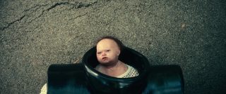 Pourtant, oui, il y a du sang, il y a du casting, on peut même dire que ça joue bien mieux que dans l’original, ça veut très certainement bien faire, mais c’est au final plus proche des quelques productions Troma du début des années 90 comme Toxic Avenger 2 et 3, ou Class of Nuke’em High 2 et 3, que d’une réelle production Troma. La déception est immense, sans doute car le trailer m’avait vendu du rêve, sauf que les passages les plus sanglants sont, pour la plupart, dans le trailer, et donc, que Toxic Avenger cuvée 2025 est gentiment sanglant, gentiment débile, mais jamais gore, et jamais profondément débile. Enfin par moment, il se lâche dans la débilité, comme lors de son final où un peu tout le monde mute n’importe comment, sauf que justement, ça sort tellement de nulle part que c’est ridicule, dans le mauvais sens du terme. Winston donc, joué par Peter Dinklage, n’est plus un attardé qui lave une salle de sport, subit une mauvaise blague et tombe dans un fut radioactif qui le change en monstre difforme à la force surhumaine dans la ville de Tromaville, mais quelqu’un qui lave les locaux d’une société gérée par Kevin Bacon qui est laissé pour mort et jeté dans des déchets toxiques et se transforme en monstre difforme à la force surhumaine dans la ville de St Roma Village (oui, les pancartes effacent un peu le S, comme ça on lit Troma). Et avant de vraiment s’attarder sur tout ce qui ne va pas, même si je l’ai déjà fait, un petit mot sur ce qui va malgré tout, et ce même si ça ne fonctionne jamais autant que le film le voudrait. Le film change donc toute l’histoire du personnage, en faisant un père de famille veuf, atteint d’un cancer du cerveau qui lui laisse moins d’un an à vivre. Du classique de chez classique, mais apportant au final malgré tout un poil plus de profondeur, car Melvin dans le film original n’avait au final aucune écriture, aucune vraie caractéristique. Du coup, il a un fils, et une fois changé en héros, son but ne sera plus de tuer les méchants et de protéger sa nouvelle petite amie aveugle (absente du remake donc), mais de tuer les méchants pour protéger son fils. Tout ça, c’est bien, mais ça ne fonctionne jamais vraiment.