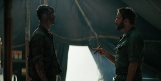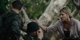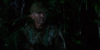 Mais pourtant, face à sa générosité et surtout, son honnêteté, ou dans ce cas spécifique, sans doute, l’honnêteté de la tête pensante du projet (bien qu’il adapte un roman), impossible de ne pas prendre du plaisir en regardant le fameux métrage. Nous sommes donc plongés en pleine guerre du Vietnam, à suivre un petit groupe de soldats qu’on envoie en pleine jungle pour une mission, simple. Dans les faits, à savoir, retrouver des soldats disparus. Evidemment, dès leur arrivée sur place, tout tourne mal, les militaires du coin ne sont pas la seule menace, des dinosaures voraces et qui n’hésitent pas, ici, à étriper leurs victimes, rodent et vont les prendre en chasse. Et autant dans son côté de grosse série B avec des dinosaures que celui du film de guerre au Vietnam, Primitive War fait le boulot, faisant les deux éléments bien comme il faut. La guerre est réaliste, les corps tombent, les soldats crient, la jungle est moite, dense, et la bande son se permet de nous sortir quelques titres rock de l’époque qui ne seront pas sans rappeler quelques grands films du genre. Quand au côté dinosaures, enfin un film qui n’oublie pas que les dinosaures, c’est censé être dangereux, attaquer, être sournois, et ne pas lâcher ses proies. Des éléments que la saga Jurassic semble d’ailleurs avoir oublié depuis bien longtemps, peut-être même le second opus original en réalité. Ici, tout le monde peut y passer, les blessures font mal, les corps saignent, sont démembrés, les tripes tombent. Les dinosaures redeviennent donc ces animaux dangereux, et pas des animaux mignons pour vendre des jouets (oui, je pense encore à Jurassic World Rebirth et son bébé dinosaure mimi). Même au niveau des personnages, on appréciera une certaine profondeur. On n’échappe pas à certains clichés, avec le grand méchant Russe dans la dernière partie, avec certains éléments, certains traumatismes. Mais quasiment chaque personnage a droit à un minimum de background et ça évite donc d’en faire de simples coquilles vides vouées à mourir.