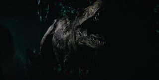 Et oui, en plus de tout ça, le métrage est hyper généreux, enchainant les scènes de poursuites, d’action, les fusillades, les dinosaures différents. Et bénéficie, petite cerise sur le gâteau, d’une technique proprement réussie, notamment sa photographie, nous offrant des plans absolument sublimes. Malheureusement, face à tout ça, Primitive War souffre sans doute de sa trop grande ambition. Cela se remarque d’entrée de jeu avec sa durée, bien grosse pour un simple B movie, mais se retrouve aussi à quelques autres moments. Si les dinosaures par exemple sont en général très bien faits, fluides à l’écran, et bien certaines incrustations, notamment lors de scènes de jour (dont une, ironiquement assez inspirée par la saga Jurassic Park), montrent alors leurs limites et paraissent beaucoup plus cheap que le reste. Pareil pour les personnages, leur profondeur est appréciable mais par moment, le film tente d’en faire un peu trop. Et on pourrait dire la même chose pour le final, qui se lâche niveau action, de très bonne tenue visuellement, mais qui abuse alors tout à coup du ralenti, alors que le film n’en utilisait pas jusque-là. Dernier point noir d’ailleurs, si la bande son est au top, et les bruitages convaincants, j’admets, j’ai souri, plusieurs fois, en entendant le son des claquements de mâchoires des dinosaures lorsqu’ils n’attrapent rien. Mais vous savez, qu’importe. Car Primitive War, c’est généreux, bis, sanglant, souvent bien fichu, et ça fait du bien.