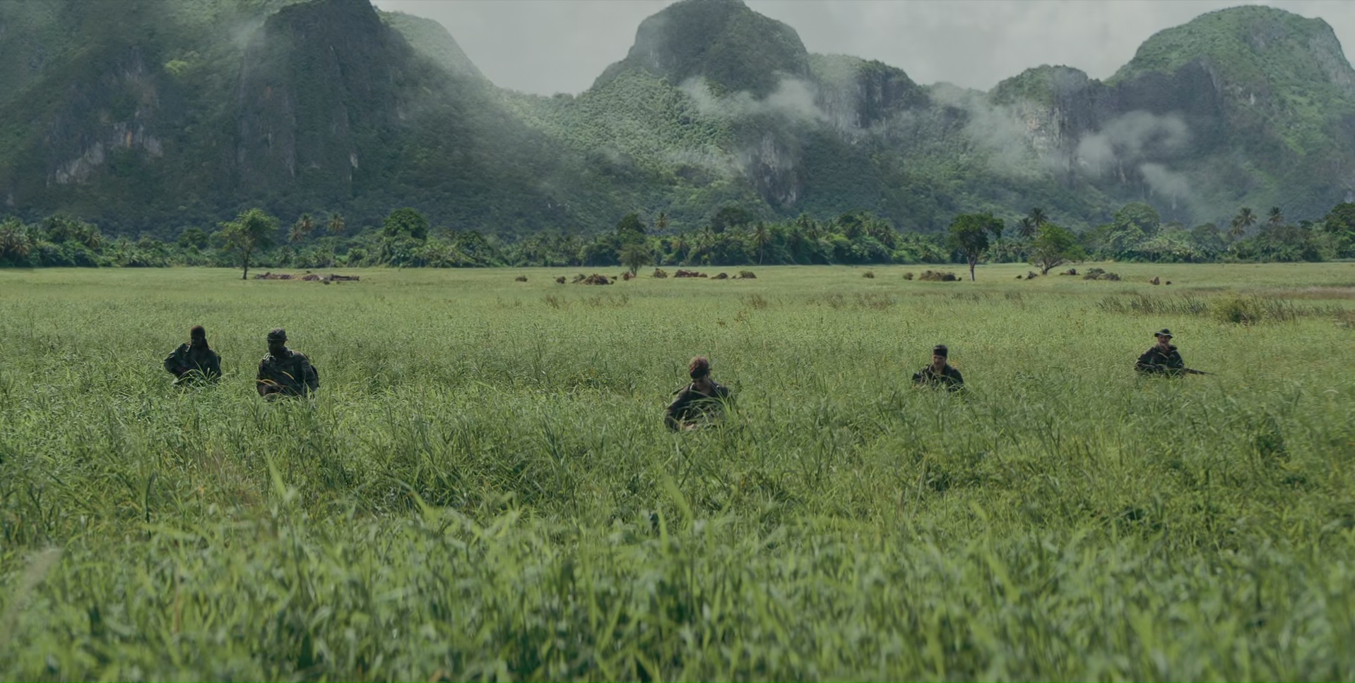 Depuis l’arrivée de son trailer, Primitive War me faisait de l’œil. Un mélange improbable entre Jurassic Park et Apocalypse Now. Et surtout, de quoi faire un peu oublier la douche froide que fut le dernier Jurassic World. Imaginez un peu, le Vietnam, en 1968, des militaires bad-ass, des missions impossibles dans la jungle, où le danger ne vient pas forcément, enfin, pas uniquement du camp adversaire en temps de guerre, mais de grands dinosaures prêts à bouffer le casting. Des vélociraptors, des T-Rex, tout ce que l’on connait, tout ce que l’on aime. Et on peut le dire d’emblée, oui, Primitive War, c’est cool. Loin d’être parfait, mais faisant tout à fait ce qu’il a en tête. A savoir être une série B, bien fichue, généreuse, faite par un passionné, Luke Sparke, que l’on trouve à pas mal de postes d’ailleurs (scénariste, producteur, superviseur des effets visuels, designeur, monteur et j’en passe). C’est clairement son film. Et en réalité, dans le fond, on pourrait rapprocher le métrage à un autre métrage produit dans des conditions un peu similaires et ayant des ambitions tout aussi similaires : Monsters of Man. Un autre petit film, indépendant, avec un réalisateur présent a pas mal de postes, lorgnant clairement vers le bon gros B movie, avec beaucoup d’effets spéciaux. Et d’ailleurs, le rapprochement va plus loin, puisque dans les deux cas, le plus gros défaut des métrages sera leur durée. 2h10 environ dans les deux cas. Et oui, autant nous sommes aujourd’hui habitués aux gros blockbusters de cette durée-là, autant lorsque l’on lorgne du côté de la série B, aussi grosse et prestigieuse soit-elle, 2h10, ça peut souvent commencer à faire long. Voilà, il fallait le dire d’entrée de jeu. Des défauts, Primitive War en a, d’autres, pleins.