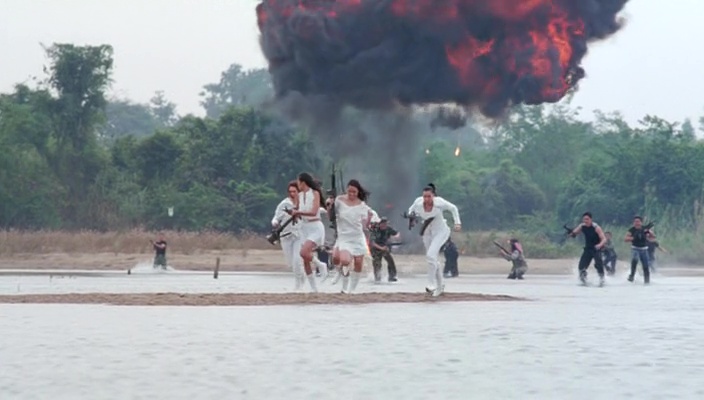 C’est beau quand un réalisateur admet les dessous de son film. Poj Arnon, réalisateur et scénariste, avoua que le production du film lui avait demandé de tout simplement faire une copie de Charlie’s Angels, le film de McG qui avait cartonné. Charlie’s Angels d’ailleurs, le premier, c’est un de mes plaisirs coupables. Le second, beaucoup moins. Mais revenons donc à Dangerous Flowers. Car le réalisateur, il se défend tout de même, en indiquant que la différence de budget (en gros, en convertissant, le budget de Dangerous Flowers tourne autour d’un millions de dollars, contre 93 pour le film de McG) et de style de combat faisaient toute la différence. Alors, le budget, nous sommes d’accord, surtout qu’ici nous sommes face à un film écrit après une forte exposition à l’alcool, et possiblement à des UV ayant rendu le scénariste aveugle durant l’écriture, filmé n’importe comment, monté à la truelle par quelqu’un ayant Parkinson, mais pour le reste, ça ne change rien. Seule différence majeure, ici nous n’avons pas 3 anges qui travaillent pour Charlie, mais 5 anges bossant pour Chai Lai. Original hein ? Et dans les faits, c’était du tout bon, car 5 belles créatures au lieu de trois, et bien ça fait deux bonnes raisons de plus de regarder le film. Surtout que, copie oblige, le film ne va pas chercher ses idées bien loin, sa scène d’ouverture se situe… oui dans un avion, comme la scène d’ouverture de Charlie’s Angels. Sauf que dans cette intrigue avec une enfant kidnappée à récupérer, le réalisateur et scénariste s’est lâché. Trop lâché. Enfin non, c’est bien qu’il se lâche, mais s’il avait pu au moins s’appliquer sur la mise en scène, ainsi que le montage, ça aurait été mieux. Et peut-être aussi embaucher un chorégraphe plus compétent, et des actrices qui savent se battre surtout, ça aurait fait toute la différence.