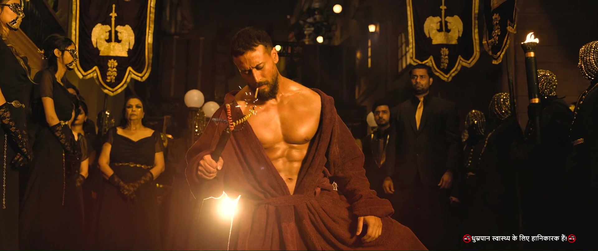 Avec Tiger Shroff donc, qui a fait des progrès pour jouer la comédie, sauf lorsqu’il s’agît de jouer le doute et l’amour. Une première partie donc pénible, qui encapsule tout ce qui peut irriter dans le cinéma Indien, avec ses couleurs pétantes, sa niaiserie assumée et volontaire, ses romances improbables et surtout difficilement crédibles, sans oublier ses acteurs qui prennent la pose pour un oui et pour un non (pour un peut-être aussi d’ailleurs), sans oublier son lot de chansons et de danses, pour la plupart loin d’être mémorables, à l’exception de peut-être une danse arrivant assez tardivement et se servant enfin des accessoires pour créer du mouvement dans l’intégralité du cadre. Sa première très longue partie semble tellement longue que l’on en vient à passer son temps à sourire non pas du film, non pas avec le film, mais de cet avertissement que le cinéma Indien ne peut s’empêcher de mettre à l’écran dès qu’un personnage boit de l’alcool ou fume une cigarette. C’est dire à quel point on s’ennuie devant le spectacle, long et pas intéressant, de mauvais goût, surtout qu’en réalité, tout est plié d’avance, on se doute bien que Tiger est un tigre, qu’il va péter des dents, qu’il n’a pas halluciné sa copine, et que quelque chose se trame. Mais le film lui a l’air persuadé de sa proposition et étire le tout, longuement, très longuement. Quand finalement le pot aux roses est révélé après une bonne heure, l’heure n’est pas encore à la vengeance, puisqu’il faudra alors présenter les méchants, et donc changer de point de vue pour retourner en arrière et bien nous faire comprendre les minces enjeux. Le premier souci, une fois que l’on a toutes les cartes en main, c’est qu’on se rend très vite compte qu’en plus d’être longuet et de ne pas tenir ses promesses nanar, Baaghi 4 est un film qui n’a aucun sens. « Pourquoi » est la question que l’on se posera le plus souvent devant le film, avec « Comment ».