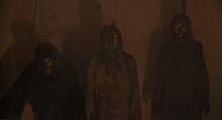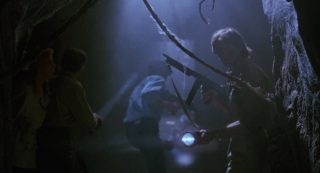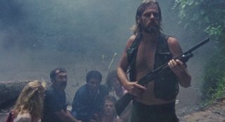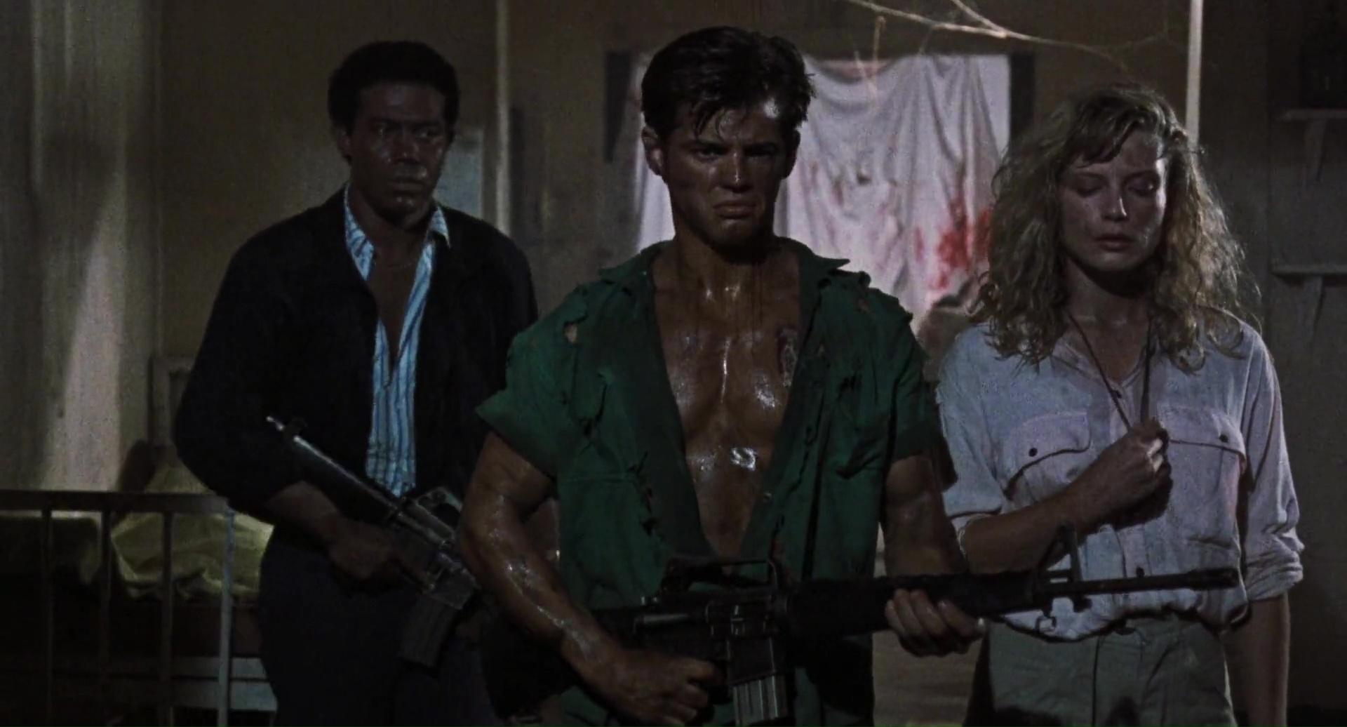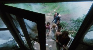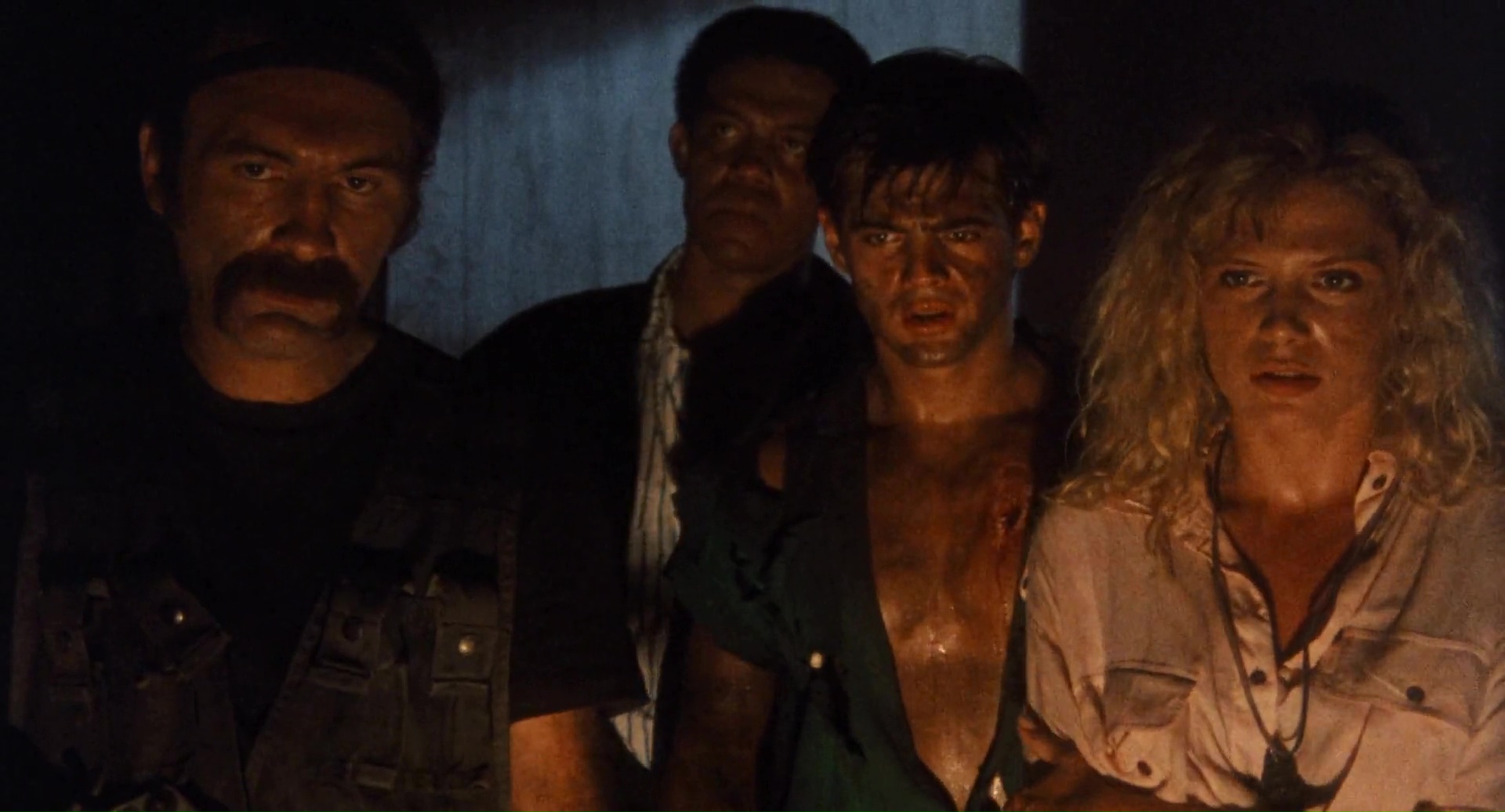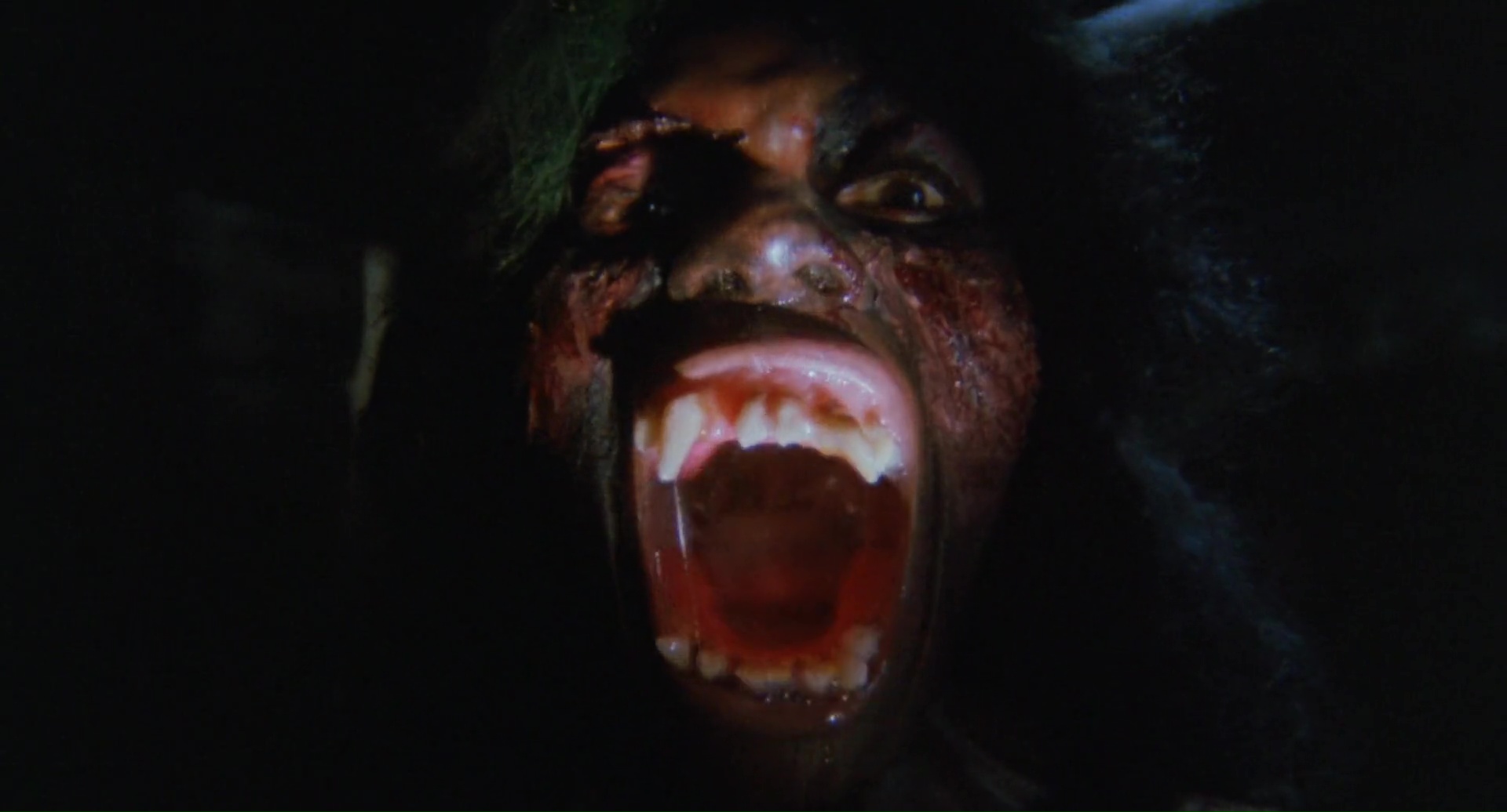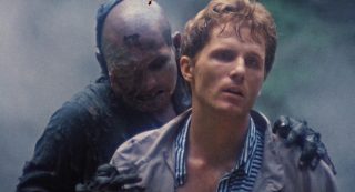 Dommage en fait que l’aspect technique fasse souvent le yoyo. On alterne un plan qui a de la gueule avec un autre juste moche, on alterne une belle idée ou une jolie photographie avec tout à coup un plan où la mise au point est partie faire une pause. On alterne un beau maquillage avec un autre rudimentaire. On alterne des zombies en mode démons, avec des zombies qui courent et font des saltos, avant de croiser des zombies guérilla se servant de M16. Niveau acting, pas de surprise, si on retrouve quelques têtes connues, ça ne joue pas très bien en général. Nick Nicholason (American Ninja 1 et 2, Platoon, et oui), Jim Gaines (Robowar, Strike Commando) et Jim Moss jouent les mercenaires comme ils peuvent, Candice Daly joue l’héroïne blonde qui peut refermer (ou pas) les portes de l’enfer, Massimo Vanni (habitué de Mattei depuis un bail) et Jeff Stryker (acteur connu dans le porno gay) s’ajoutent au casting en « explorateurs », tandis que James Sampson joue (surjoue) le prêtre vaudou dans l’ouverture, aux côtés de Geretta Geretta jouant sa femme, habituée aux productions de Mattei (Les Rats de Manhattan et Shocking Dark), mais surtout ayant déjà été un démon avec le même look dans Demons de Lamberto Bava. Un casting varié, même si peu sont cités au générique (étonnant tiens), et que la moitié semble se demander ce qu’ils font là. Beaucoup de choses, de son casting à sa direction d’acteurs, de l’inconsistance de son scénario et de sa technique, ne vont pas dans Zombie 4. Pourtant oui, avec son rythme de croisière bien mené, quelques moments sanglants qui font plaisir, et énormément d’influences mais pas collées bout à bout ou simplement recopiées, le métrage parvient à avoir un petit capital sympathie et bis que Zombie 3 n’avait pas, par exemple. Et étonnement, j’aime beaucoup la musique même si elle est très étrange pour un film de ce genre, correspondant plus à un film d’aventures léger.