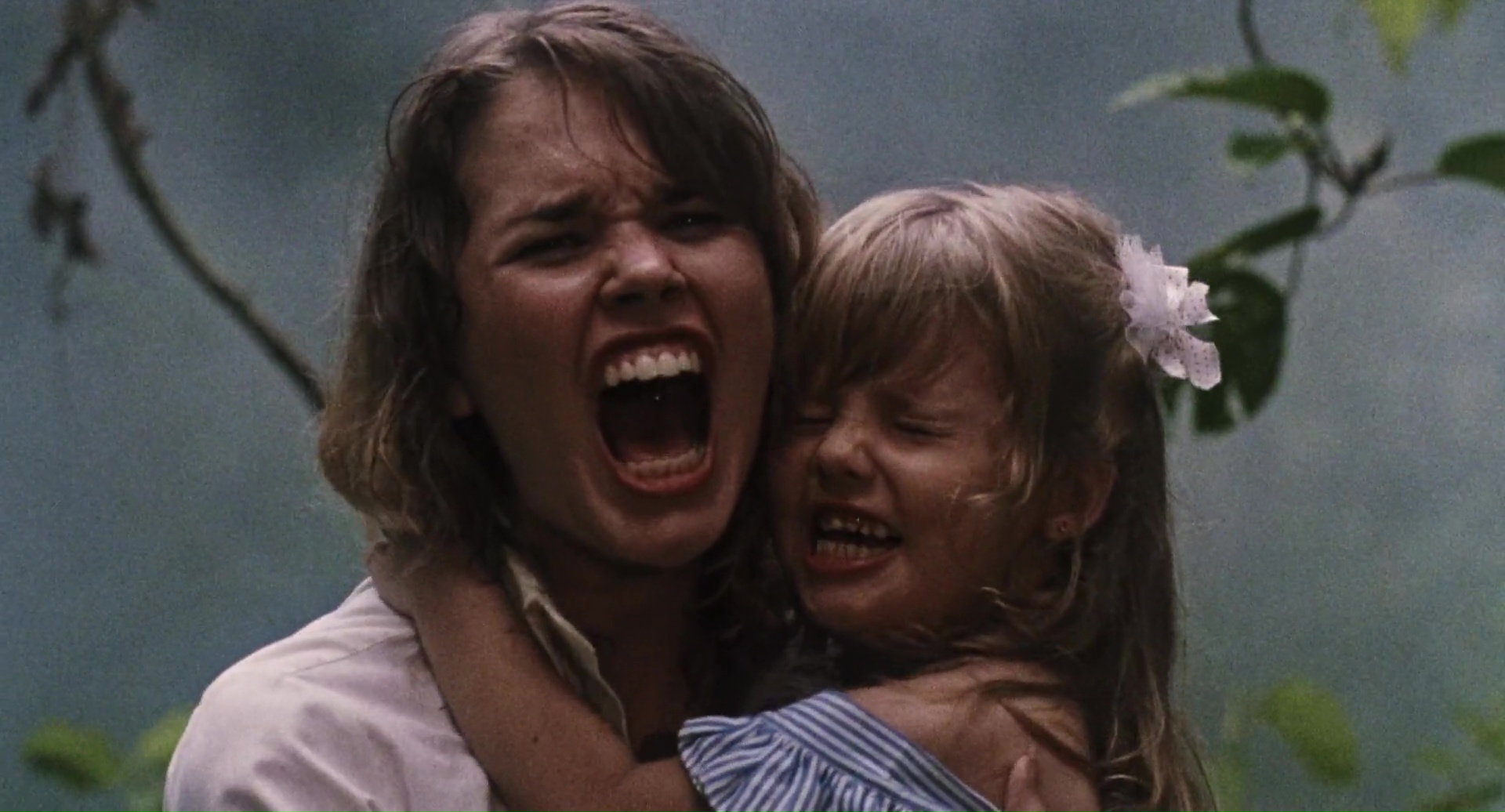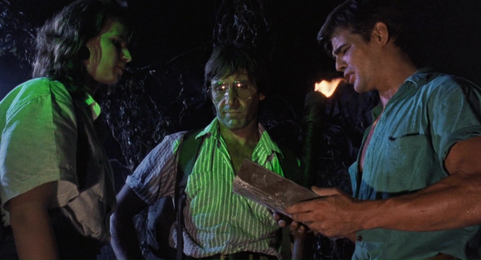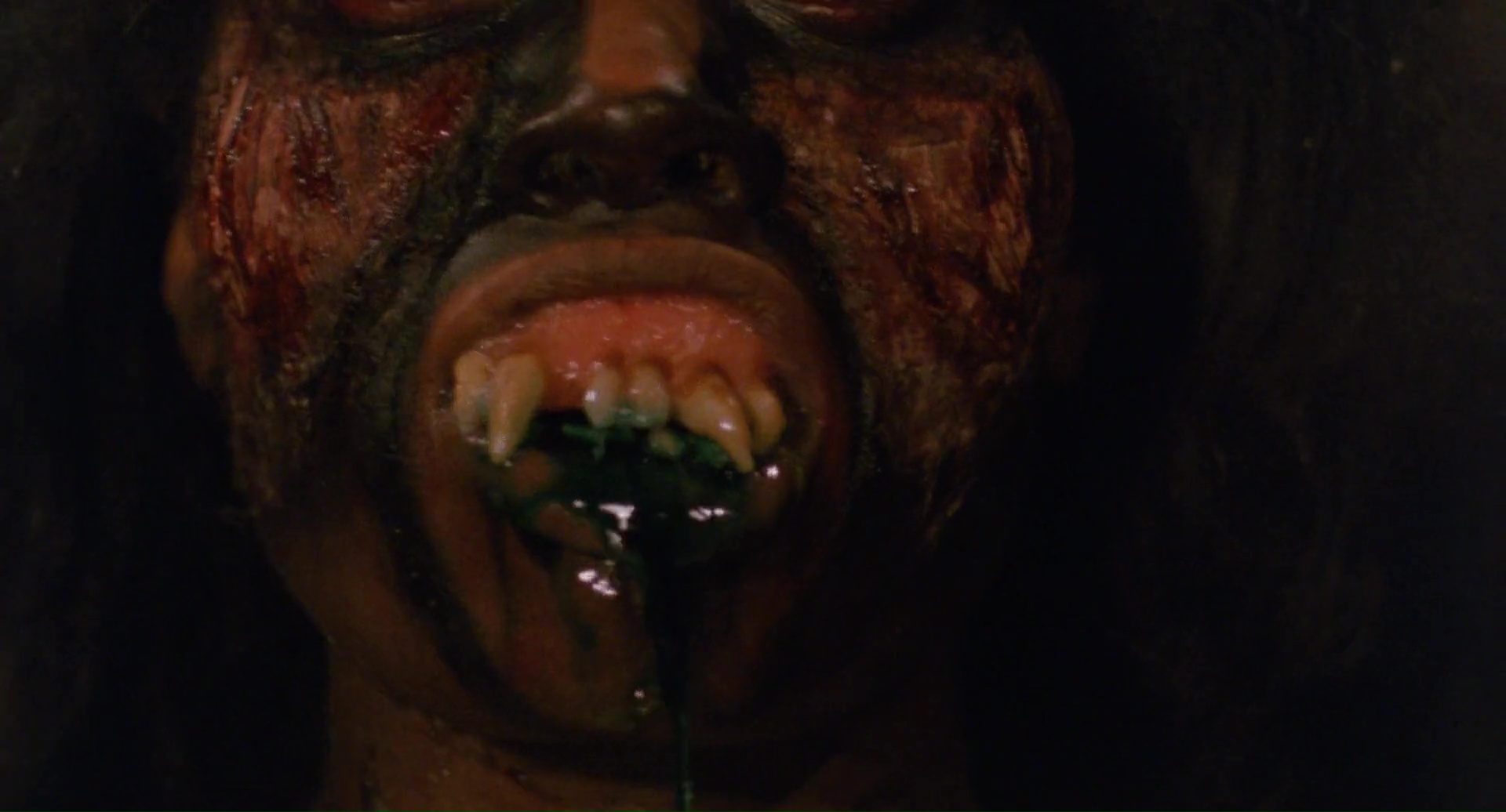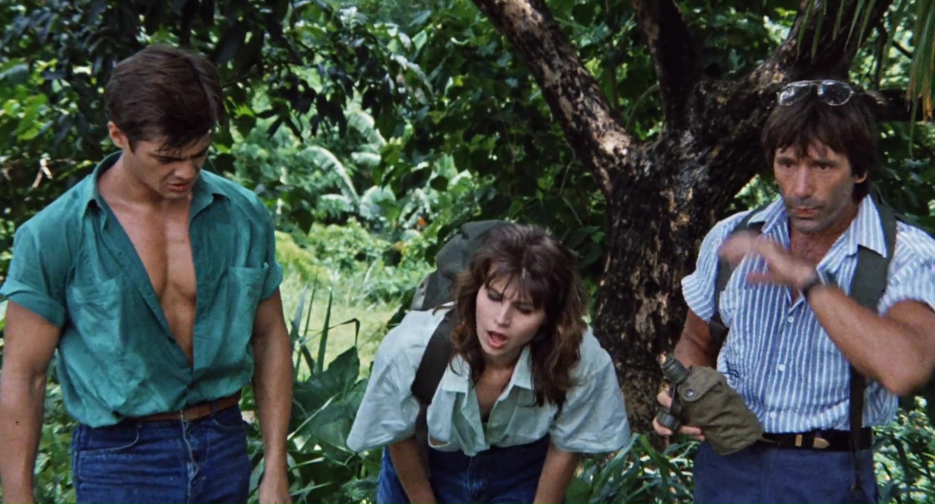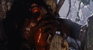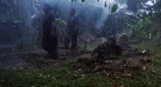 Nous avons donc une ouverture assez incompréhensible, avec vaudou, ouverture des portes de l’enfer, un prêtre qui sacrifie sa femme pour se venger et maudire l’île car des méchants scientifiques en fait pas méchant n’ont pas pu sauver sa fille. Les scientifiques débarquent, armés de mitrailleuses (ça a changé les scientifiques), butent le prêtre, mais sa femme revient en mode Demons (de Lamberto Bava), bave aux lèvres et grandes dents en option, bute tout ce bon monde dans un festival sanglant sympathique, avant que Jenny ne survive. 20 ans plus tard, Jenny revient sur l’île avec des mercenaires, et on ne saura jamais vraiment pourquoi en réalité elle revient, puisqu’elle n’a pas l’air bien heureuse de revenir. Pourquoi des mercenaires alors qu’il lui faudra une heure de films pour annoncer qu’elle commence à se souvenir de ce qu’il s’est passé ? Le scénario n’a pas la réponse à toutes ces questions. Et puis il y a un autre groupe sur l’île, des… euh… explorateurs, je crois, et ils trouvent un livre des morts (toute ressemblance avec Evil Dead est accidentelle, promis), et les morts vivants, qui courent, parlent et se servent d’armes débarquent, les deux groupes se rejoignent, et vont tenter de survivre, voire de fermer les portes de l’enfer. Oui c’est un gros bordel qui pioche un peu partout mais qui, contrairement à un film de Mattei au moins, tente de faire sa propre soupe avec tout ça, plutôt que de bêtement copier un scénario sans talent (Robowar pour Predator, Shocking Dark pour Aliens, Cruel Jaws pour les Dents de la Mer). Alors oui, on a du Evil Dead, du Demons, du Fulci, et même un peu d’avion de l’Apocalypse pour les zombies qui peuvent coordonner les attaques et donc penser. Le tout avec la jungle comme dans beaucoup de productions du genre, et une ouverture donc 20 ans avant les événements, qui semble elle avoir été tournée en Italie, et donc, avec une équipe totalement différente. Et il y a beaucoup de choses à dire. Zombie 4 oui n’est pas un bon film, mais il a au moins le mérite de divertir en allant vite, très vite (trop ?). Fragasso n’est pas un génie, mais parvient par moment à livrer quelques beaux plans et bons effets gores.