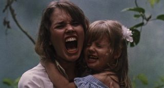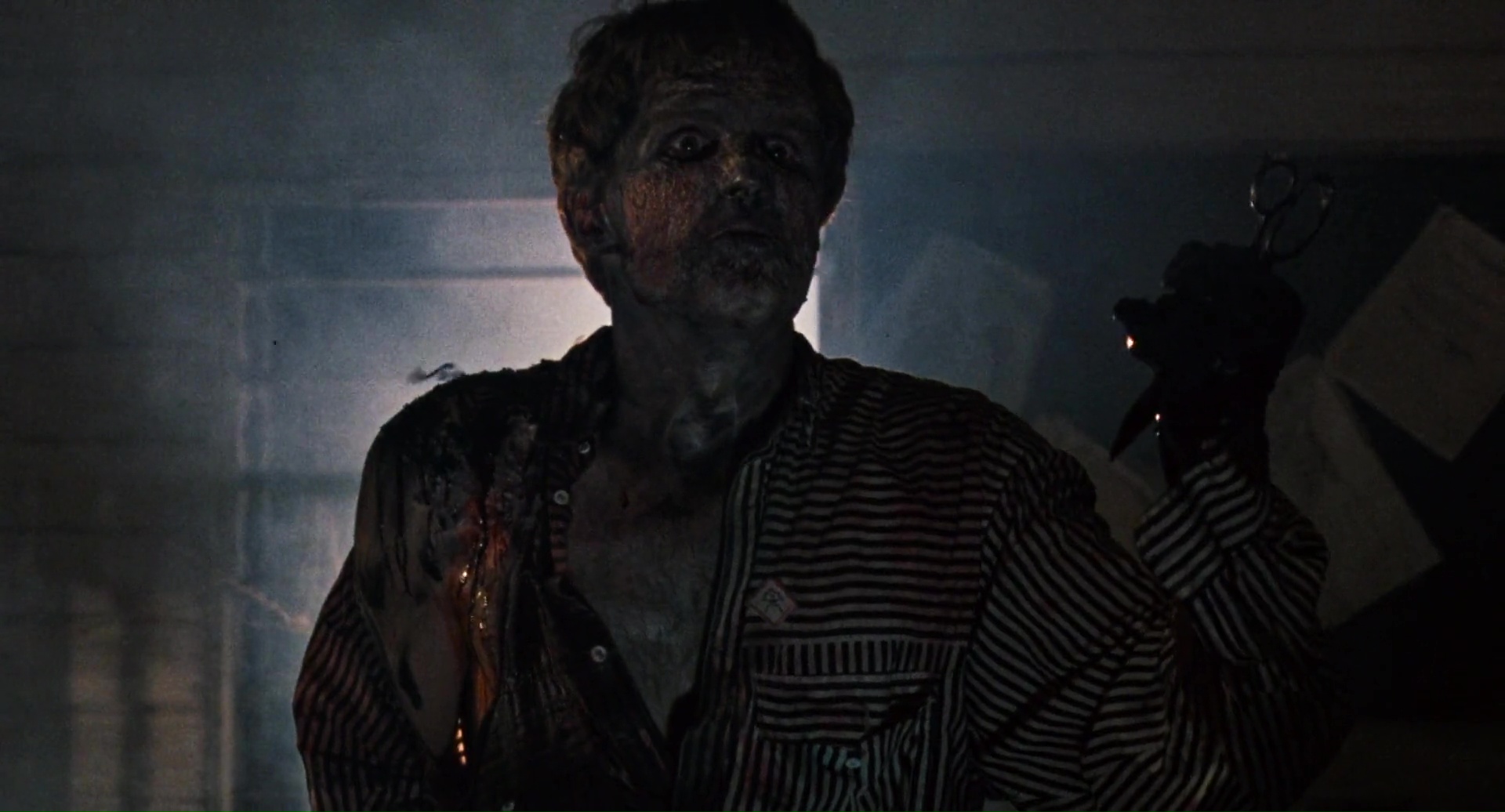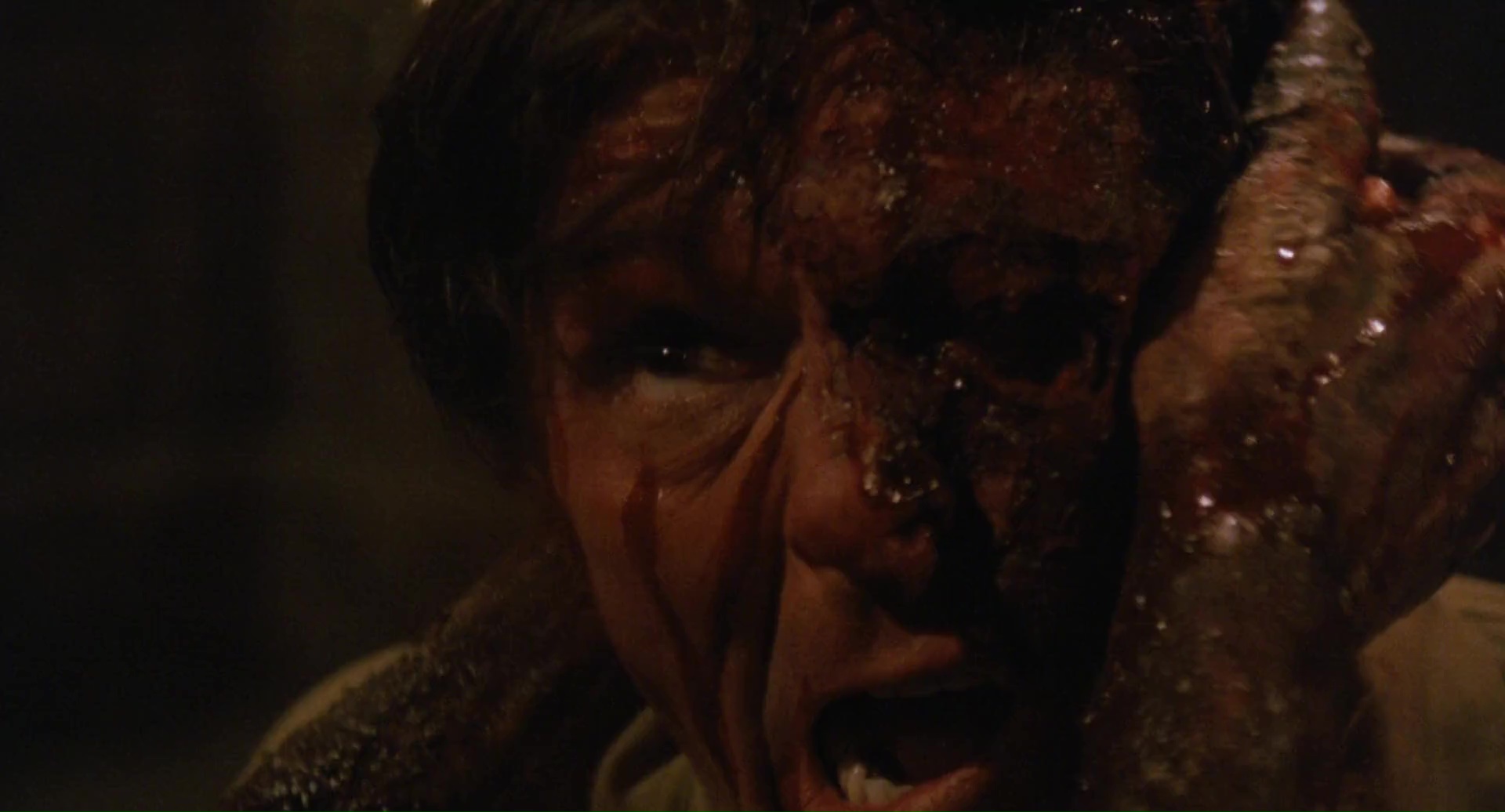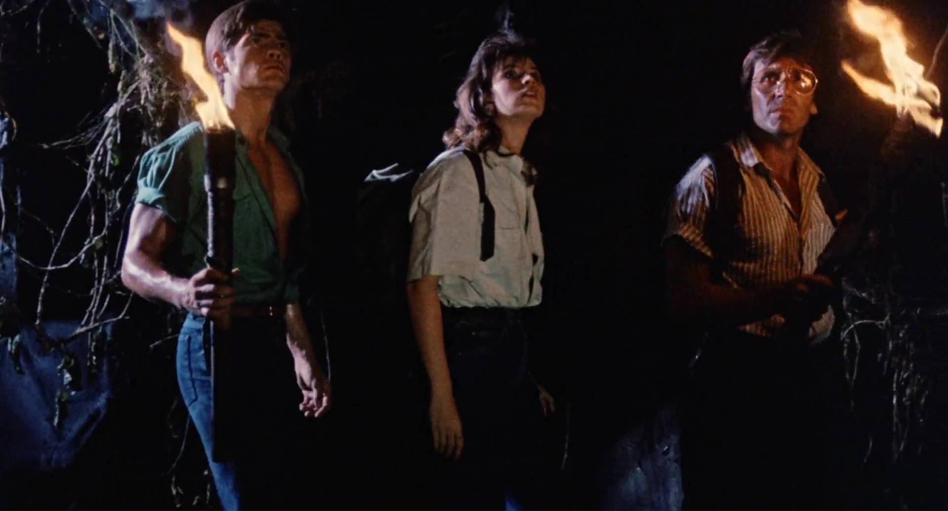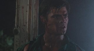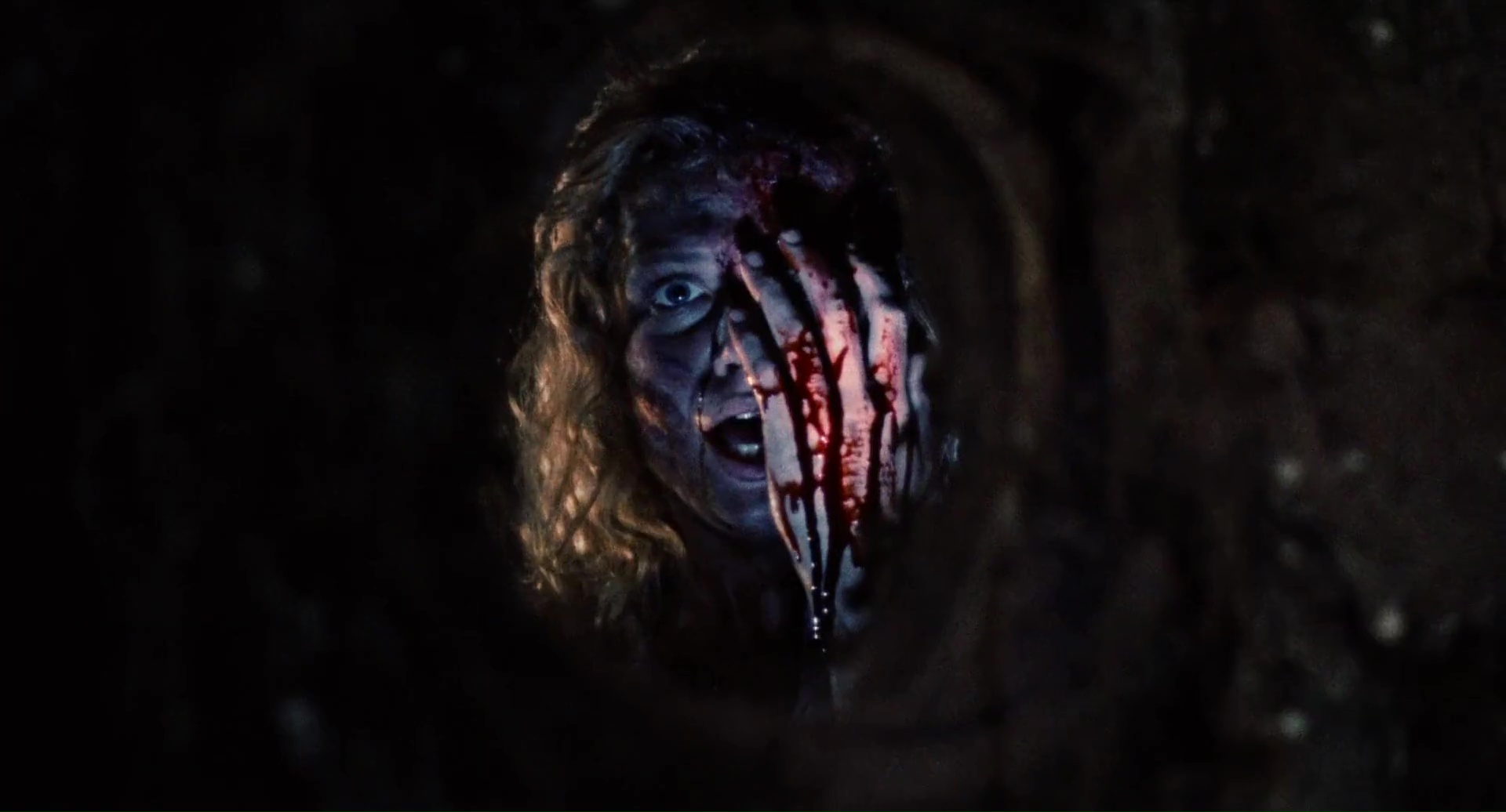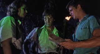 Et je peux donc l’avouer, 1h28 plus tard, que si ce n’était pas bon, et que là aussi ça surfe sur pas mal d’autres succès, et bien c’était à mes yeux meilleur que Zombie 3 et donc, que l’œuvre de Mattei. Je ne partais pourtant pas confiant, car Fragasso, toujours actif de nos jours (il aurait signé un Karate Man en 2022), c’est l’homme derrière Troll 2. Zombie 4, d’entrée de jeu, trahit en tout cas ses conditions de tournage particulière. Un tournage guérilla, dans l’urgence, avec quasiment pas d’argent, et surtout, avec un Fragasso qui, de jour, tournait un film de guerre, et tournait donc Zombie 4 la nuit, vu que 80% du film se déroule de nuit. Ce que certains bonus semblent confirmer, lorsque l’on peut voir une équipe enchainant les prises, sans trop savoir où aller, mais en essayant juste de corriger ce qui ne va vraiment pas, prise après prise. Oui, une méthode de tournage assez spéciale. Mais donc Zombie 4, qui n’a rien à voir avec Zombie 3, ni avec Zombi 2, ni avec Zombie, qu’est-ce que c’est et pourquoi je trouve ça tout de même plus honnête qu’un putassier Zombie 3 ou qu’un film de Mattei tout court ? Déjà, Fragasso dresse un scénario, ou du moins une ébauche de scénario, qui ne reprend pas la figure du mort-vivant que l’on connaissait avec le film précédent (le méchant gouvernement et la toxine qui contamine les gens), mais retourne, un peu comme L’Enfer des Zombies de Fulci, à la base du genre, avec du vaudou derrière toute cette histoire. Dommage par contre que son scénario, signé Rossella Drudi, pas aidé non plus par un montage ultra chaotique durant ses 20 premières minutes, ne sache jamais où aller. On me dira que l’on n’attend pas ça d’un film de ce genre, c’est vrai, mais là c’est tout de même d’un brouillon assez monstrueux, avec deux périodes temporelles, séparées de 20 ans, qui se superposent presque sans rien pour nous l’indiquer. En réalité, j’ai mis plusieurs minutes avant de comprendre que oui, nos héros, et la blonde du film, Jenny (Candice Daly), sont là 20 ans après la scène d’ouverture, et que Jenny est la survivante de la scène d’ouverture, la gamine qui a donc bien grandie. Oui c’est brouillon au point que ce simple détail devient complexe.