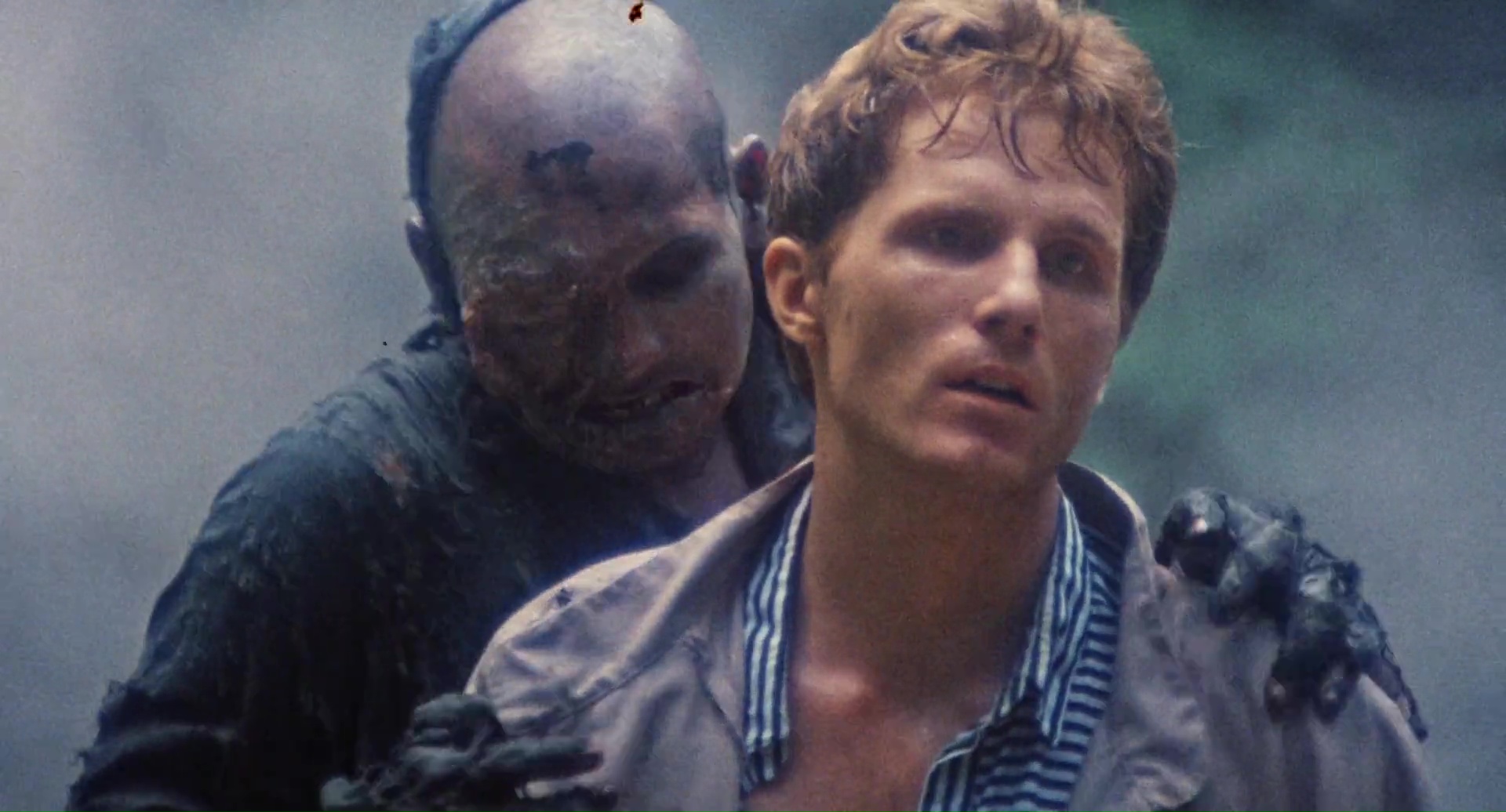En général, quand on parle de gros bis italien, et surtout de nanar Italien, il y a deux écoles, qui parfois, se rejoignent, car l’amateur de nanar n’est parfois pas bien compliqué. Il y a ceux qui vouent un culte à cette période de quelques années où l’Italie avait produit en quantité un peu trop grande du post-apo fauché, et où tous les réalisateurs se sont lancés dedans (Dedodato, Fulci, D’Amato, Mattei, Martino, tous je vous dis). Une période courte de quelques années seulement, mais qui au moins, permet de varier les plaisirs et les styles vu le nombre de réalisateurs ayant œuvrés dans le genre. Et il y a ceux qui vouent un culte à Bruno Mattei, tâcheron improbable qui transforme tout ce qu’il touche (et il touche à beaucoup de choses, sauf à l’argent vu ses budgets) en métrage opportuniste. Bruno Mattei, c’est Les Rats de Manhattan, Robowar ou encore Terminator 2, alias Shocking Dark. Et Zombie 3 aussi. Et je ne suis pas du tout fan de Bruno Mattei, car autant certaines de ces scènes respirent l’incompétence et en deviennent, il est vrai, hilarantes, surtout que la direction d’acteurs, c’est un concept qu’il ne connaît pas, mais Mattei, entre deux scènes à même de marquer son public, il m’ennuie. Il faut dire que quand c’est mauvais au point de ne pas être joué, ni réalisé, ni monté parfois, je baille. En plus évidemment de copier sans vergogne de bien meilleurs films (Predator, Aliens, Les Dents de la Mer). Pour moi, Bruno Mattei, il est tout en bas de l’échelle. Du coup, son Zombie 3 m’ayant laissé sur un bien mauvais souvenir, et pourtant dieu sait que j’ai essayé plusieurs fois de lui donner une chance, et bien j’avais fait l’impasse sur Zombie 4, et ce même si son nom, ni même son pseudo de Vincent Dawn, n’apparaissent pas au générique. Car Zombie 4, même si tourné un peu en même temps par Claudio Fragasso (souvent scénariste pour Mattei), aux Philippines aussi, et bien ça me faisait peur. Mais quand on aime le cinéma Italien et qu’on veut briller en société, on se lance. C’est donc parti pour Zombie 4 After Death, ou tout simplement dans son pays natal Oltre la Morte.