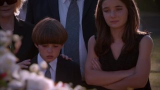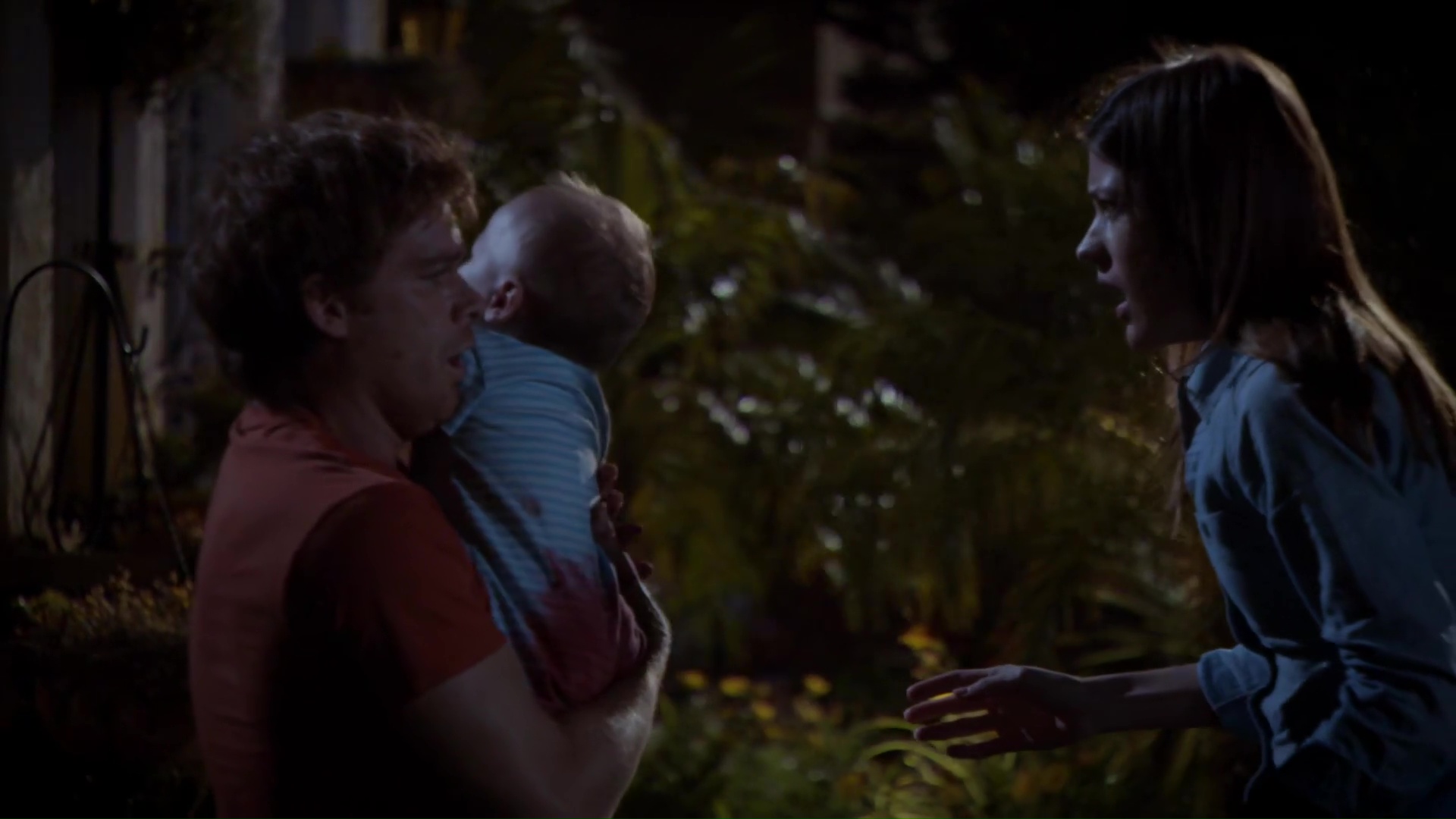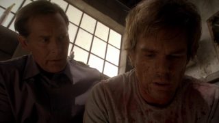 Difficile de passer après une saison 4 qui aura mit tout le monde d’accord. Surtout quand, en coulisses, des changements s’opèrent doucement. Les showrunners originaux des quatre premières saisons ne sont par exemple plus là, et au fur et à mesure des saisons à venir, les scénaristes aussi, changent. Alors pour cette saison 5, on pourrait dire que le changement est encore minime, car oui, certaines scénaristes restent, certaines réalisateurs, solides, sont toujours derrière la caméra pour plusieurs épisodes, à l’image de Steve Shill (là depuis la saison 1), John Dahl (depuis la saison 3) ou encore Ernest Dickerson. Et c’est vrai. Surtout qu’en devant parler forcément de l’après saison 4, on sait d’office que cette cinquième saison sera très différente des précédentes, et qu’elle mettra en avant un ton plus sombre en abordant chez Dexter non pas la famille, les amis, ou l’amour, mais bel et bien le deuil. A ce titre, le premier épisode fait parfaitement bien le relais avec la saison 4 en étant en quelque sorte l’épisode parfait, fort, montrant un Dexter qui est bel et bien doté d’émotions, quoi qu’il en dise. De plus, sa culpabilité est extrêmement présente, dès le départ. « I did it » qu’il dira à la police. Et surtout, ce premier épisode peut se targuer d’avoir fait un choix, à la fois scénaristique et de mise en scène, très fort, lorsque Dexter annonce à Astor et Cody la fameuse fin de la saison 4. Comment quelqu’un comme Dexter, souvent sans émotions, va-t-il expliquer tout ça, alors qu’il est lui-même sous la culpabilité, le doute, et tout un tas d’autres émotions ? Et bien ça donne une scène assez osée, entre humour noir (les enfants qui reviennent et offrent des oreilles de Mickey toutes mignonnes à Dexter) et un ton brut assez salvateur. Surtout que la caméra ne s’éloigne jamais des acteurs, et fait le choix de pleinement montrer les réactions de Christina Robinson et Preston Bailley, des enfants acteurs, et que leur faire jouer cela peut devenir à double tranchant… et ils gagnent haut la main en étant crédibles, voire déchirants.