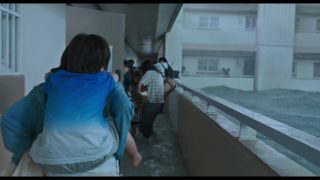 Si je ne cours pas après le cinéma Coréen, force est de reconnaître malgré tout le talent de leurs équipes techniques, puisqu’on ne pourra jamais leur reprocher ça, c’est souvent beau. Mais voilà, de temps en temps, ça arrive, un film venant du pays du matin calme m’attire, et vu que le cinéma Coréen est encore aujourd’hui l’un des cinémas Asiatiques les plus en avant, que ce soit dans les salles de cinéma ou en streaming, la question de la disponibilité se pose bien moins que pour le cinéma Japonais, Chinois, Vietnamien ou Indonésien. J’ai donc jeté mon dévolu en cette fin d’année sur l’une des dernières sorties sur Netflix, à savoir, Submersion. Car après tout, j’aime le cinéma catastrophe, même lorsque le genre est cliché, le cheminement balisé. Sauf que contrairement à ce que l’on peut penser en se lançant, Submersion n’est pas qu’un simple film catastrophe sur les eaux qui montent, et cette mère et son fils qui tentent de survivre aux événements. Malheureusement pour lui. Car cette partie, la première moitié du film en gros, est réussie. C’est visuellement impressionnant, parfois pesant et claustrophobique, les enjeux au départ simples (la survie dans un immeuble de cette petite cellule familiale) deviennent rapidement plus grands (l’espèce humaine s’éteindrait aujourd’hui), la mise en scène est simple et appliquée, à hauteur d’homme, et l’enchainement des galères se fait rythmé. Bref, tout ce que l’on attend du genre, et ça fonctionne, à quelques micro éléments près, clichés inévitables du genre, que l’on pardonne aisément face à la générosité et la propreté de l’ensemble.