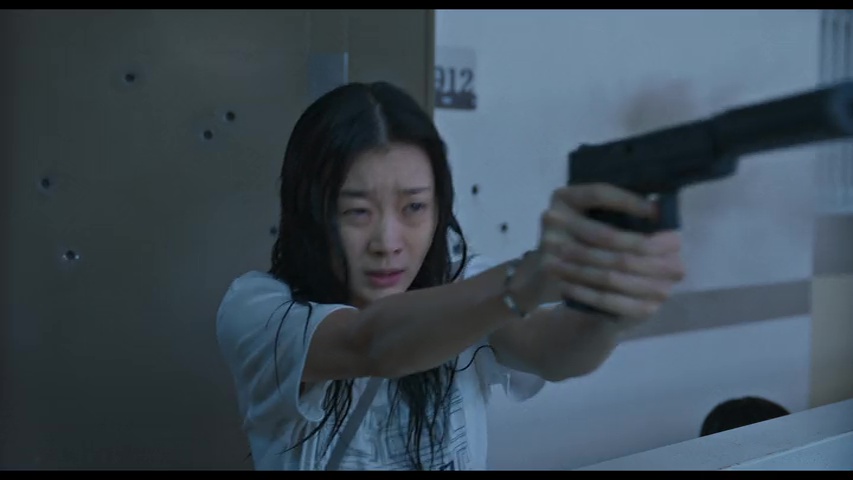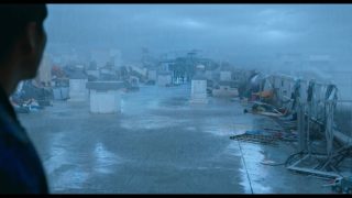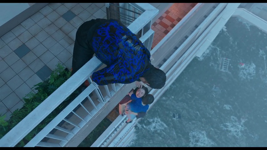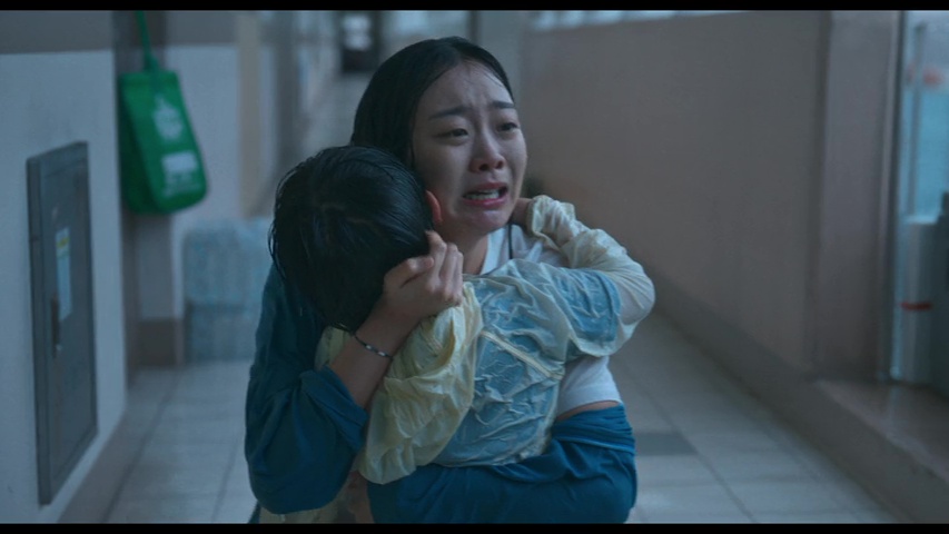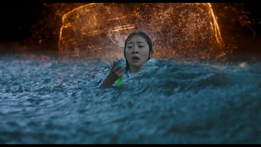 Surtout qu’au-delà de la bonne tenue visuelle du métrage, et du côté réaliste et impressionnant des CGI, ce qui reste souvent bien trop rare en 2025 pour le souligner, le film peut compter sur la solide interprétation de Kim Da-mi, découverte par beaucoup dans The Witch Part 1, où elle était déjà excellente. La mise en scène, tout comme le scénario, sont signés par Kim Byung-woo, réalisateur beaucoup trop rare, et qui s’était d’ailleurs déjà essayé au film catastrophe, un poil conceptuel, avec The Terror Live, il y a 12 ans. Oui, quand je disais qu’il était rare, c’est le cas, seulement 5 longs métrages en 17 ans, dont deux en 2025. Mais voilà, c’est bien là le souci, car autant visuellement, Kim Byung-woo livre une copie propre, impressionnante et qui souvent nous happe avec lui, avec cette montée des eaux que l’on ne peut arrêter, ses étages entiers inondés ou parfois, qui explosent carrément, et dont où la seule option est de monter, toujours plus haut, bref, autant il gère tout ce qui est visuel et gestion du genre du film catastrophe, autant le film opère un changement brutal mi-parcours, comme si le film voulait prouver qu’il pouvait être bien meilleur que les autres, plus ambitieux, et… et non, ce n’était clairement pas la chose à faire en réalité. On a un peu l’impression que le film voudrait jouer dans la cour des films de Christopher Nolan en réalité, et là, vous aurez le choix entre l’accepter, dans toute son imperfection, le rejeter en bloc, ou bien en rire et poursuivre l’aventure. Pour ma part, ce fut la dernière option, le changement brusque m’aura à la fois fait soupirer et rire, et dès lors, mon implication dans le métrage était bien moins présente, sans pour autant rejeter l’œuvre et le divertissement proposé en bloc, puisqu’en dépit de ce que le film veut nous raconter, l’ensemble reste bien rodé en termes de gros divertissement.