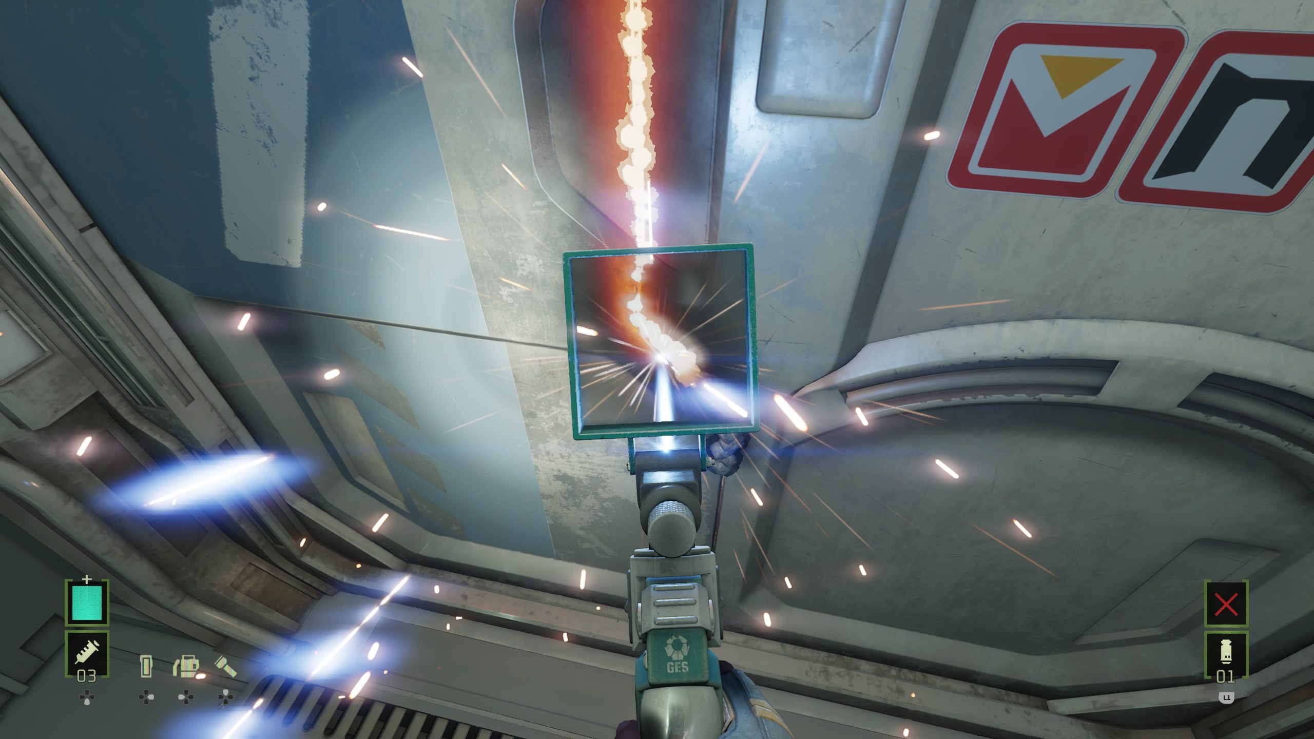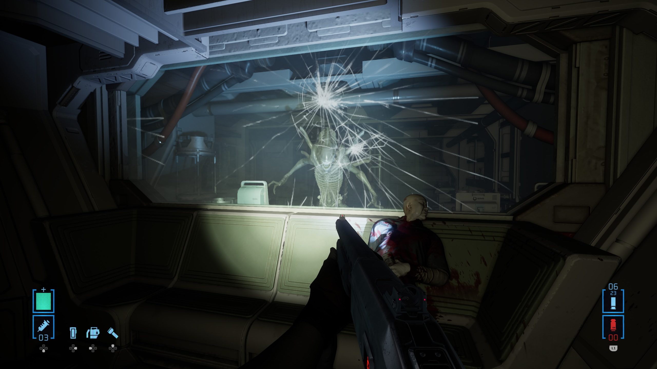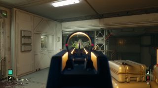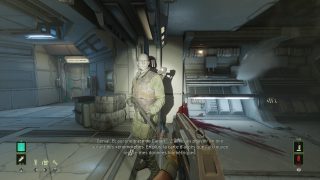 Mais revenons au commencement. Rogue Incursion était donc un jeu en vue FPS prévu pour la VR qui débarque en jeu « normal » qui se joue normalement sur une télévision. Est-ce que le jeu et l’expérience voulue, son ambiance, fonctionnent toujours ainsi ? Et bien oui. Dans les faits, la formule n’est pas bien différente d’un Alien Isolation, sauf que l’on a des armes, et que les xénomorphes vont morfler, plus proche donc d’Aliens le Retour de James Cameron que de Alien de Ridley Scott. Après une courte cinématique d’introduction où l’on fait la connaissance de notre héroïne, Zula Hendricks, ancienne marines et son mal de dos qui a une confiance aveugle en Davis 01, son androïde reprogrammé, nous nous écrasons directement sur Purdan, et après une très courte déambulation dans le vaisseau au sol qui nous fait comprendre les commandes du jeu (courir, esquiver d’un bond en arrière, tirer, recharger, réparer des tableaux électriques pour débloquer des portes), les portes s’ouvrent et nous voilà donc sur la planète où se trouve un complexe infesté d’Aliens. Le gameplay est efficace, même s’il garde des traces de son origine VR qui rendent le tout inutilement maladroit. Les sensations de tirs par exemple, sans doute grisantes en VR, sont ici assez étranges, comme si l’on n’avait pas assez de recul comparé à notre puissance de feu. Le pire étant ce gimmick purement VR de pouvoir ramasser tous les objets qui trainent, d’une clé à molettes à un casque d’ouvrier. Totalement inutile dans les faits, là où en VR, cela démontrait un gros moteur physique, et la possibilité pour le joueur de s’amuser (en ramassant un casque et en le mettant sur notre tête). Ici, on a l’impression de voir une feature inutile qui aurait dû quitter le jeu mais se retrouve là, venant parfois semer le doute sur les objets utiles à ramasser et les inutiles. Rien de dramatique, mais il faut le dire.