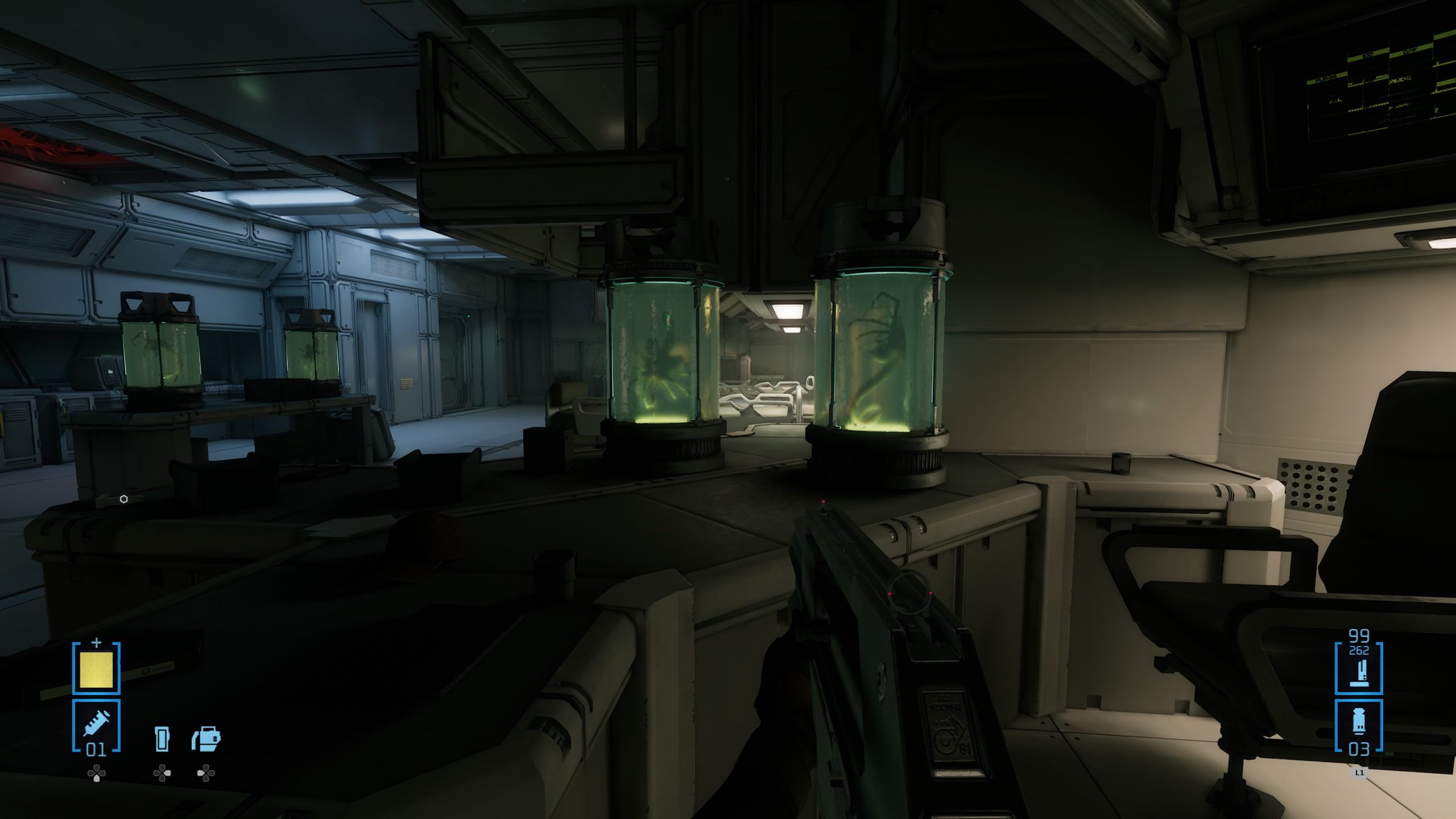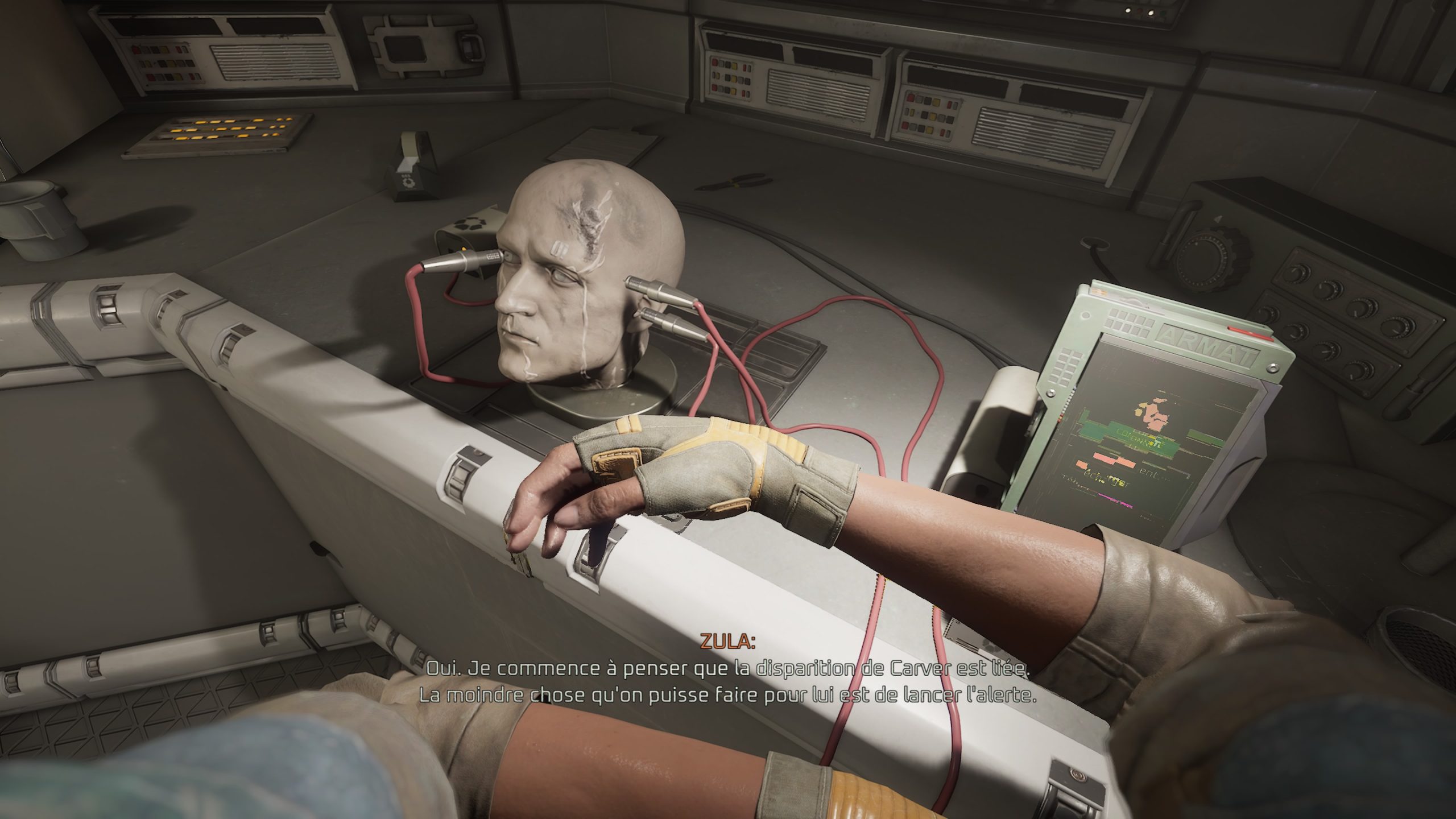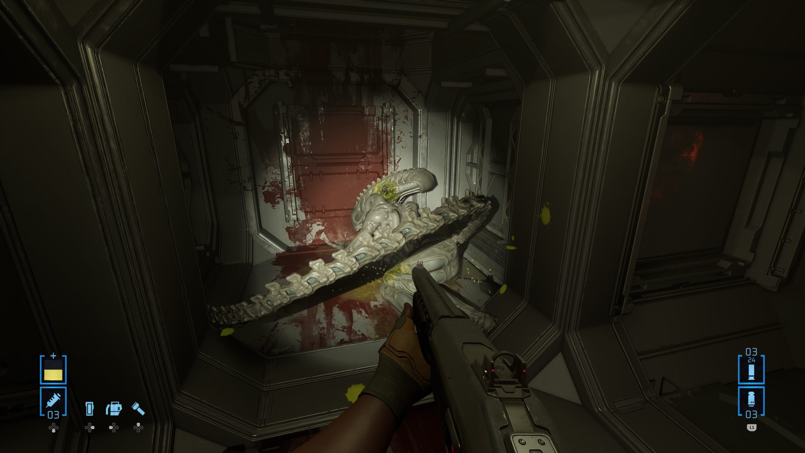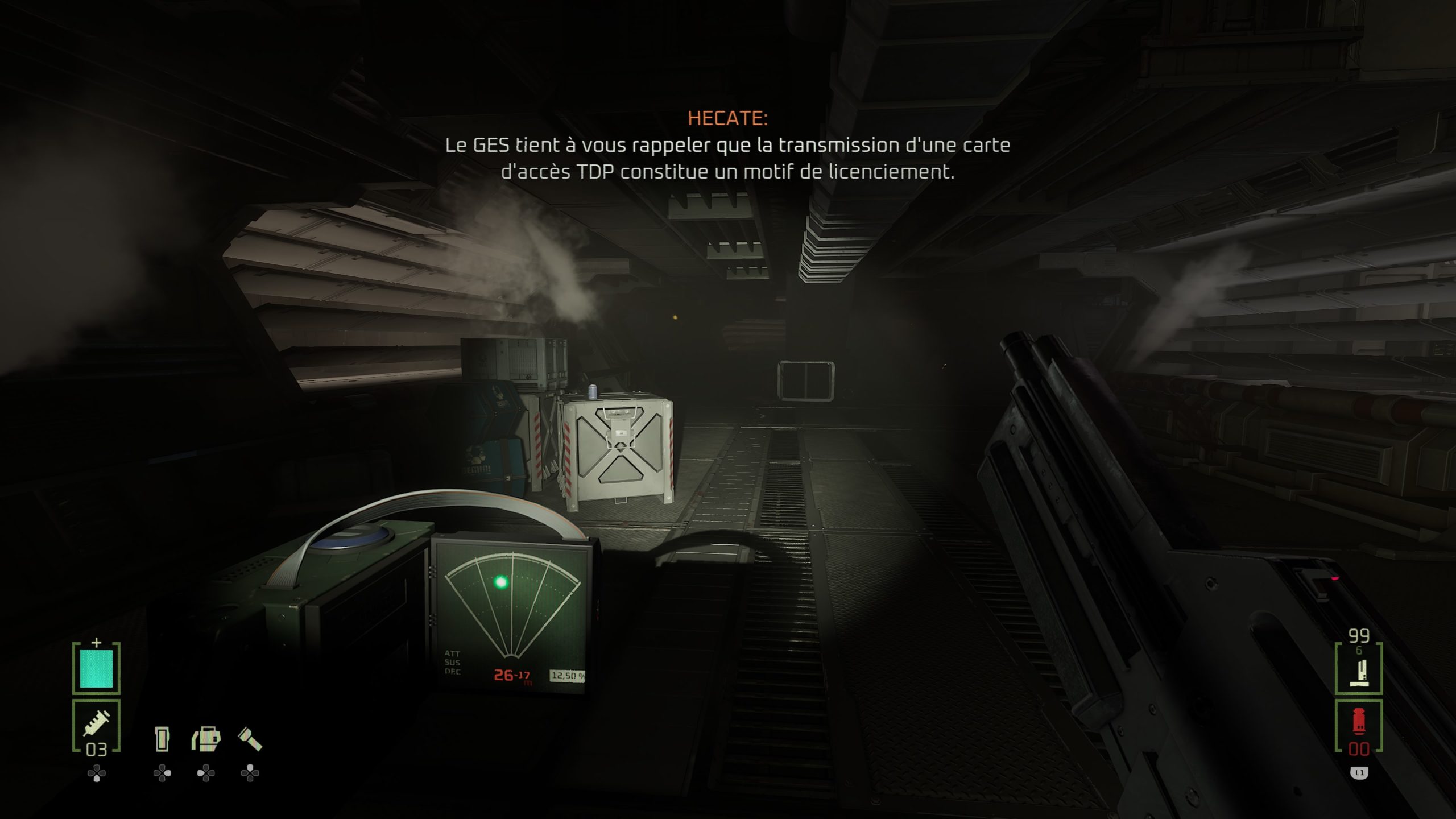 En réalité, tous les défauts, que ce soit avec ces QTE pour l’interaction avec certains objets, ou son manque de surprise générale surtout lorsque l’on connait la saga depuis ses débuts, je le pardonne. Ce qui est moins pardonnable, ce sera les quelques bugs, et surtout les bugs bloquants. Lors d’une mission, le jeu envoie le joueur à deux endroits pour récupérer deux objets vitaux pour avancer. Sauf qu’à mon premier essai, la carte m’indique n’importe quoi. Pas grave, je ferme le jeu, je relance la partie, et là, l’objet n’apparaît tout simplement pas dans l’entrepôt où il devait être. Heureusement, le jeu ayant la bonne idée de nous permettre de charger les cinq dernières sauvegardes, je peux revenir en arrière, et tenter de débloquer la situation, faisant enfin apparaître les deux objets nécessaires au bon endroit. Un comble, ce bug existant déjà depuis la version VR, et pouvant potentiellement bloquer le joueur, surtout qu’il arrive à un endroit assez avancé de l’histoire, juste avant de faire la dernière zone du jeu. Ça, je le pardonne beaucoup moins, puisque nous sommes à la fois face à un bug sur l’apparition d’un objet, mais aussi parfois sur un bug d’interface, la carte du jeu étant parfois traitre et mal fichue. Heureusement au final, avec un peu de patience, on peut se débloquer, et la map n’est pas non plus énorme. Et donc, je préférerais retenir le positif de ce Rogue Incursion, malgré son twist final, en espérant que la suite débarque bien en 2026, sinon je risque d’oublier tout ça. Mais pour un jeu à bas prix, au départ en VR, le résultat est plus qu’honorable et m’aura fait oublier les déconvenues de la saga depuis le génial Alien Isolation.