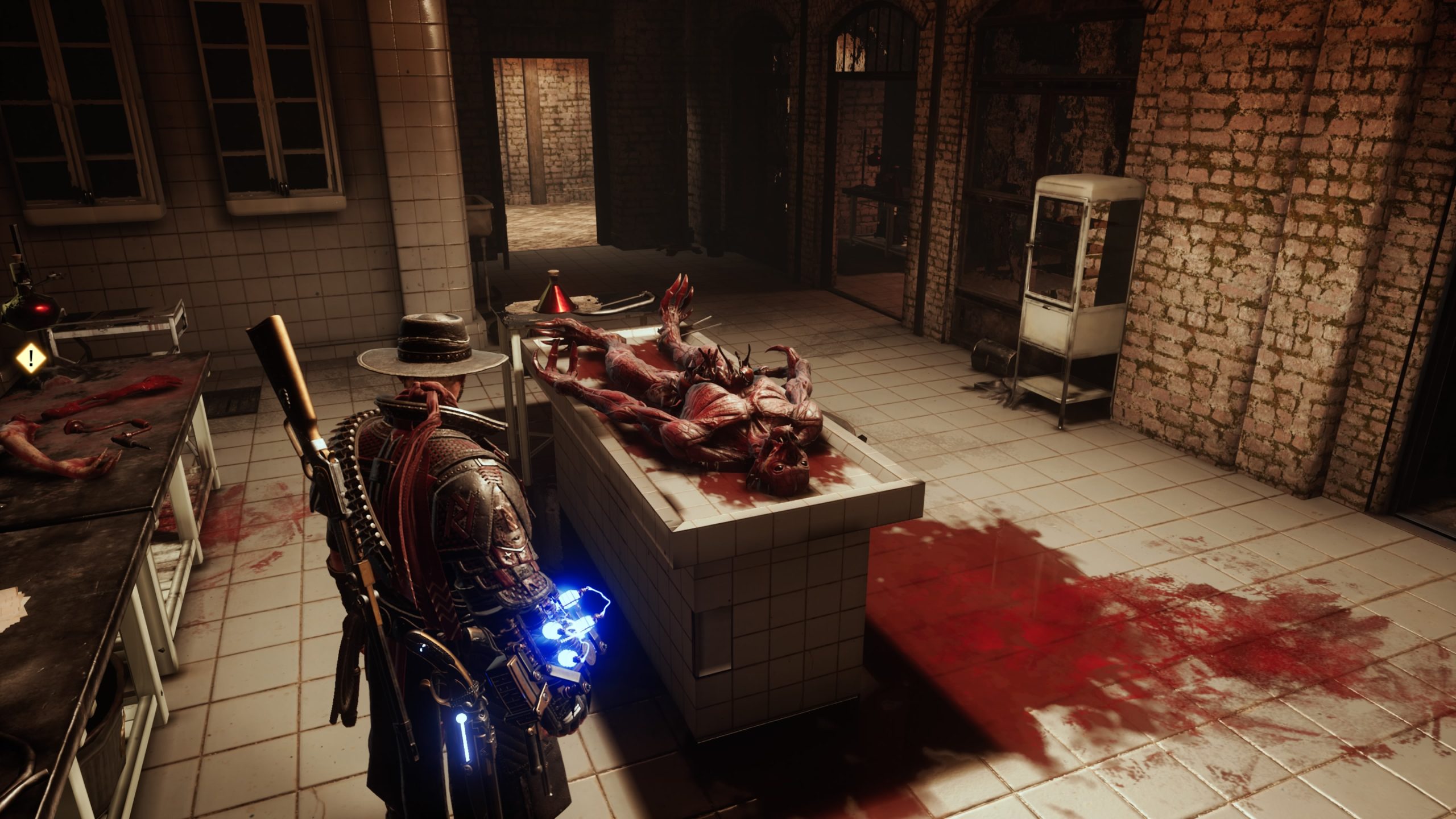 Qu’importe. Dans le premier niveau, faisant office de tutoriel, nous apprenons en toute logique les bases élémentaires du gameplay oh combien subtil. En gros, on va évoluer durant 16 chapitres dans des niveaux fermés, des couloirs plus ou moins bien camouflés, en tuant absolument tout ce qui va se dresser sur notre route. Attaques à distance en utilisant des armes à feu classiques et typiques de l’époque, lance-flamme très utile pour brûler les toiles d’araignées, une gatling peu puissante mais avec une belle vitesse de tir, et bien entendu notre gant, sur notre main droite, qui permet d’éclater la tête de ce qui est sur notre route, et d’utiliser diverses attaques électrifiées une fois les compétences débloquées. Des compétences allant de l’électrocution temporaire de tous les ennemis, au run rapide jusqu’à un ennemi avant de le latter comme sur un ring de boxe jusqu’à la monumentale et très puissante attaque ultime. Niveau gameplay, Evil West ne renouvelle rien mais se montre être un élève plutôt appliqué, malgré un petit élément qui vient dynamiser les affrontements de manière assez inattendue. Là où en général, le joueur donne le rythme aux affrontements en fonction de nos enchainements, Evil West prend une tournure différente. Une tournure qui ne change rien au côté extrêmement bourrin et parfois jouissif du jeu, mais une tournure qui change la dynamique générale, puisque ce n’est pas le joueur qui instaure le rythme des affrontements, mais les ennemis. Le joueur lui devra réagir, en fonction des attaques en approches, et des ennemis face à lui. Et soit je suis très nul, soit le jeu se corse bien sur la fin (ma partie fut effectuée en mode normal), mais parfois, lorsque nous arrivons dans une zone blindée d’ennemis, dont des petits et des gros, et que tout ce bon monde nous fonce dessus, entre les attaques à distance, les ennemis courant vers nous avant d’exploser, les gros qui nous chargent avec une hache, voire des ennemis bien plus énervants (ceux se cachant dans le sol, ou ceux tirant des toiles d’araignées, qui nous ralentissent), c’est rapidement le bordel.