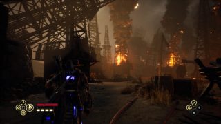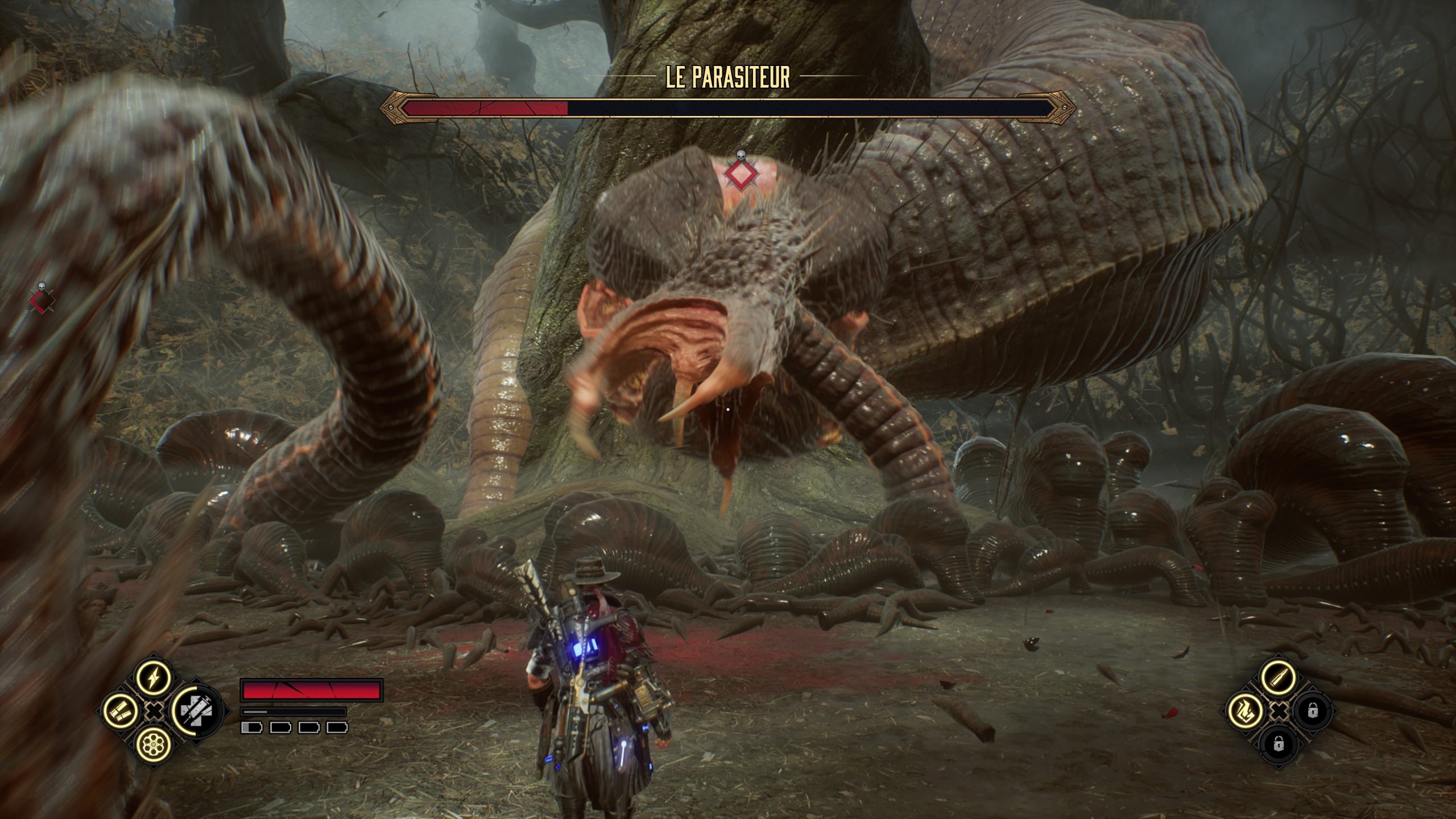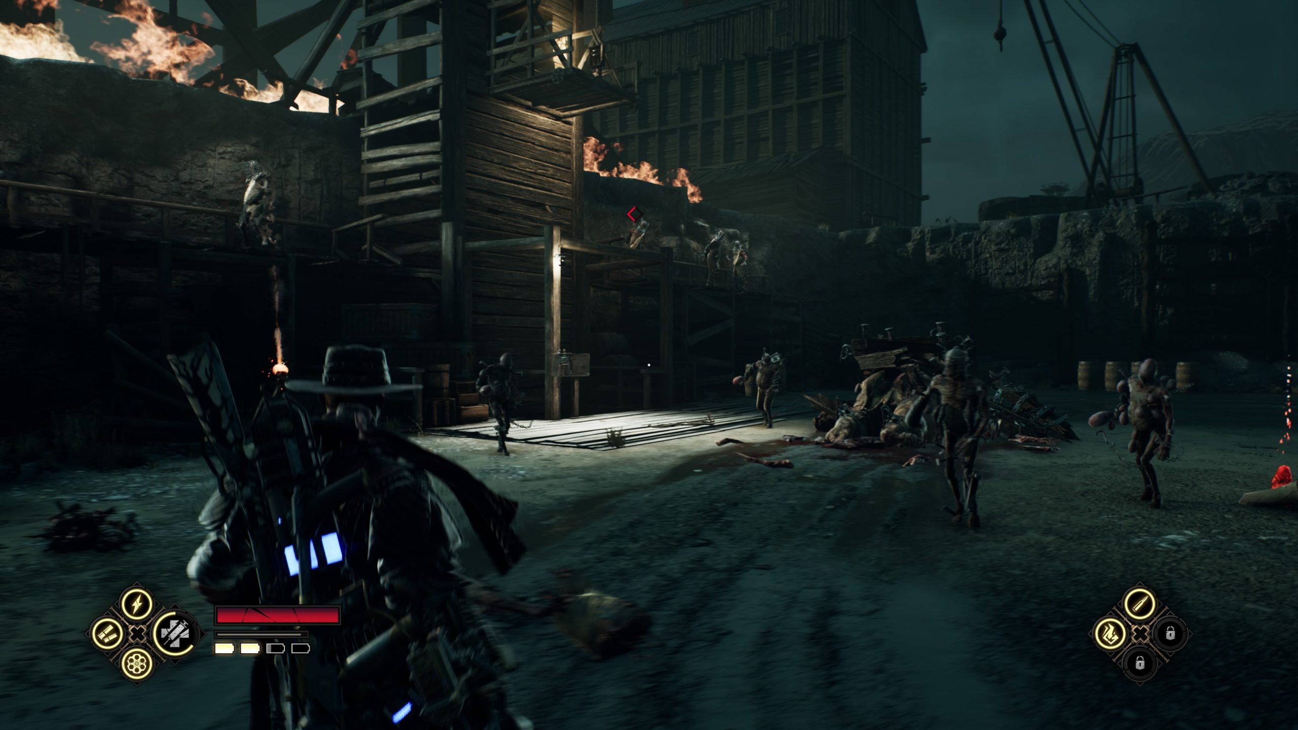 Clichée du début à la fin mais fort plaisante à suivre, une intrigue qui fait le boulot sans être trop envahissante (pas de cinématiques de 5h), avec des gentils qui ont tous un franc parlé, et des méchants très méchants pour être détestables et avoir envie de les buter. Ni plus, ni moins, pendant environ 10 heures donc. Ceci dit, et ce défaut peut s’appliquer au final à beaucoup de jeux de ce genre, mais évidemment, le gameplay s’avère assez rapidement répétitif, l’ajout de nouvelles compétences ne venant pas franchement réinventer l’ensemble, mais comme le jeu ne tire pas sur la corde en durée de vie (contrairement au dernier Assassin’s Creed Shadows par exemple), on ne lui en veut pas vraiment, surtout que les niveaux durent pour la plupart environ 30 minutes, et donc que le jeu peut se faire par petites sessions. Quant aux boss, ils ne sont pas très nombreux, et offrent un bon challenge. On n’est pas dans Dark Souls, mais certains sont sans pitié et n’hésitent pas à nous enchaîner comme pas possible. Dans le fond donc, Evil West fonctionne et arrive à être ce qu’il veut être, à savoir un petit jeu fort sympathique. Et dans la forme ? Graphiquement déjà, Evil West fait le boulot (encore une fois). Ce n’est jamais renversant, ça aime en mettre néanmoins pleins les yeux avec des effets de lumières, des flammes, de la fumée, de la brume, partout, tout le temps, mais l’ambiance western assez rare dans les jeux fait plaisir, et le tout est plutôt bien modélisé, à défaut d’être vraiment beau. Enfin, beau, ça l’est, parfois, mais perfectible, et jamais renversant. Au niveau sonore par contre, la bande son est assez anecdotique, et donc totalement oubliable. Les bruitages sont fonctionnels mais comme on en vient rapidement à utiliser les mêmes coups, les mêmes armes, les mêmes tactiques, l’aspect limité des bruitages rentre vite en jeu. Pas honteux, mais comme pour les graphismes, vite limité.