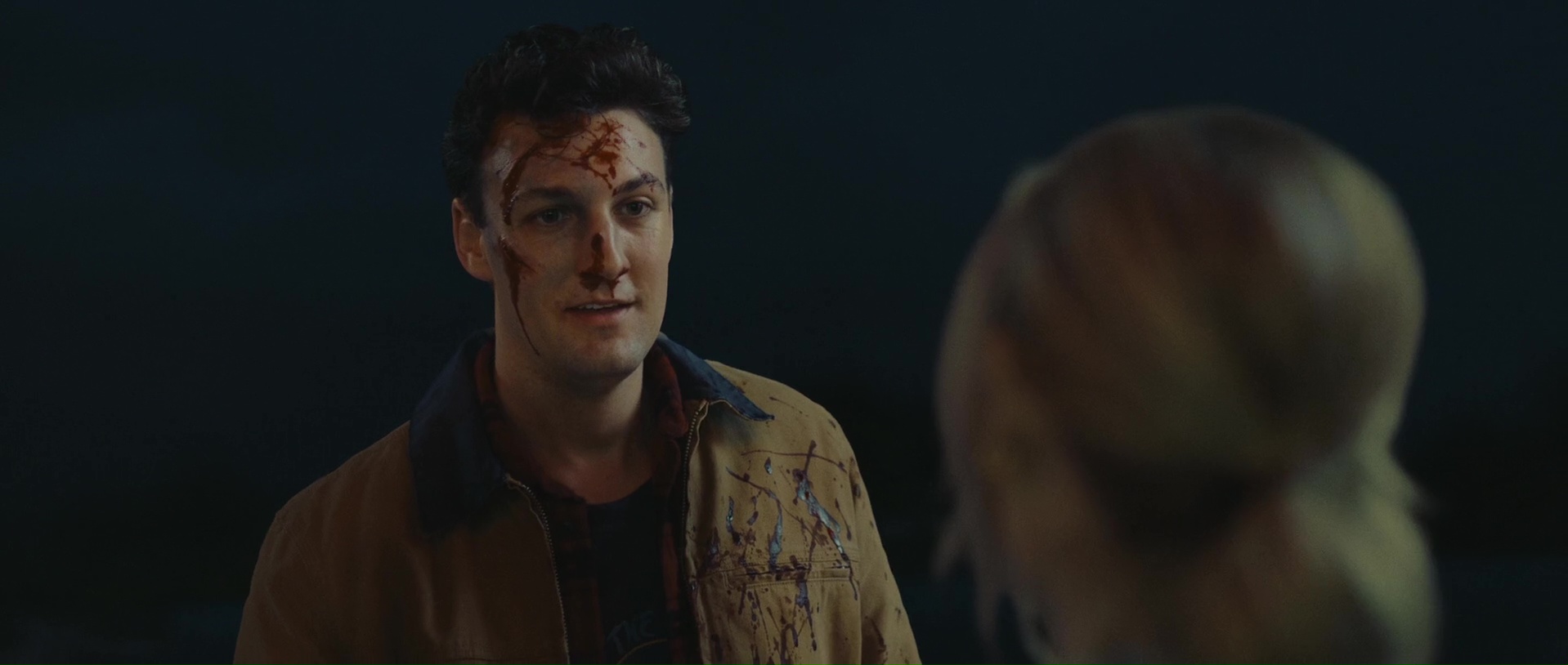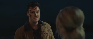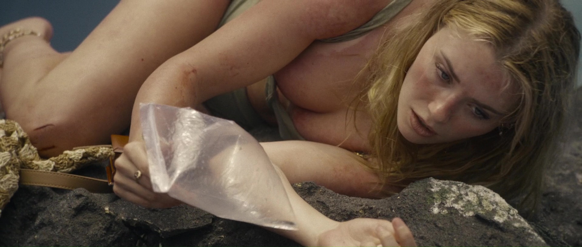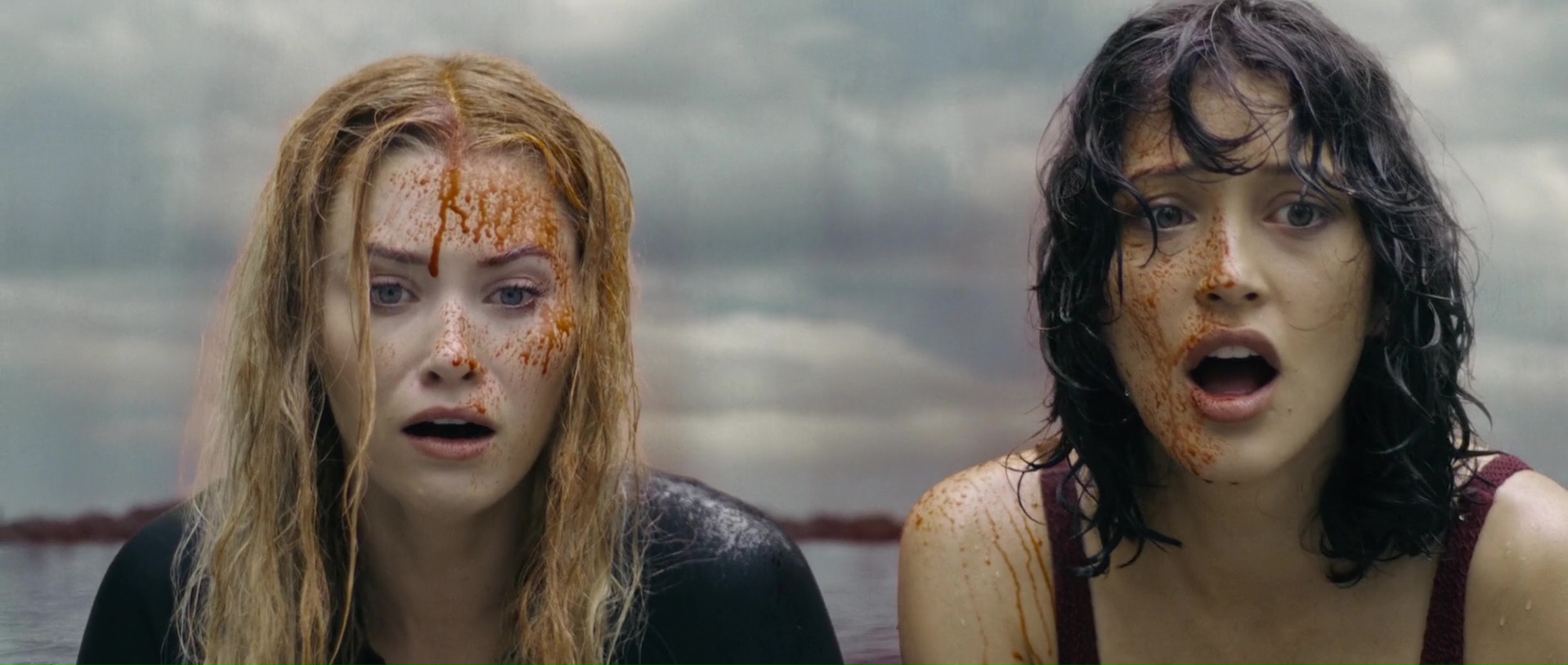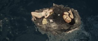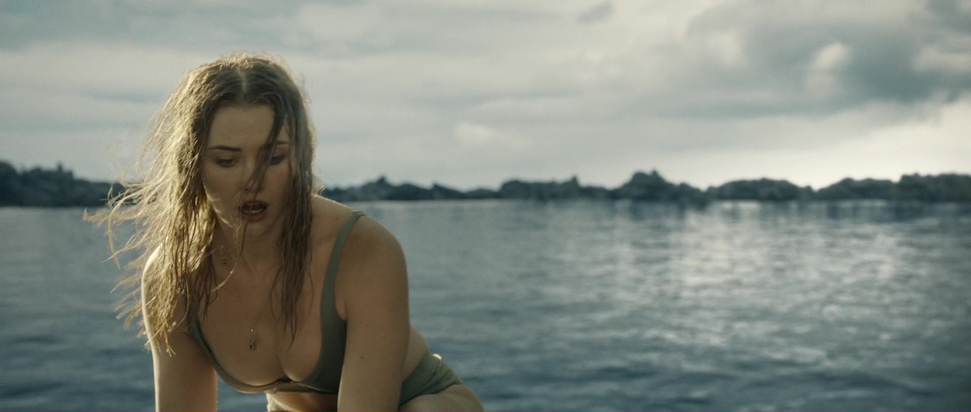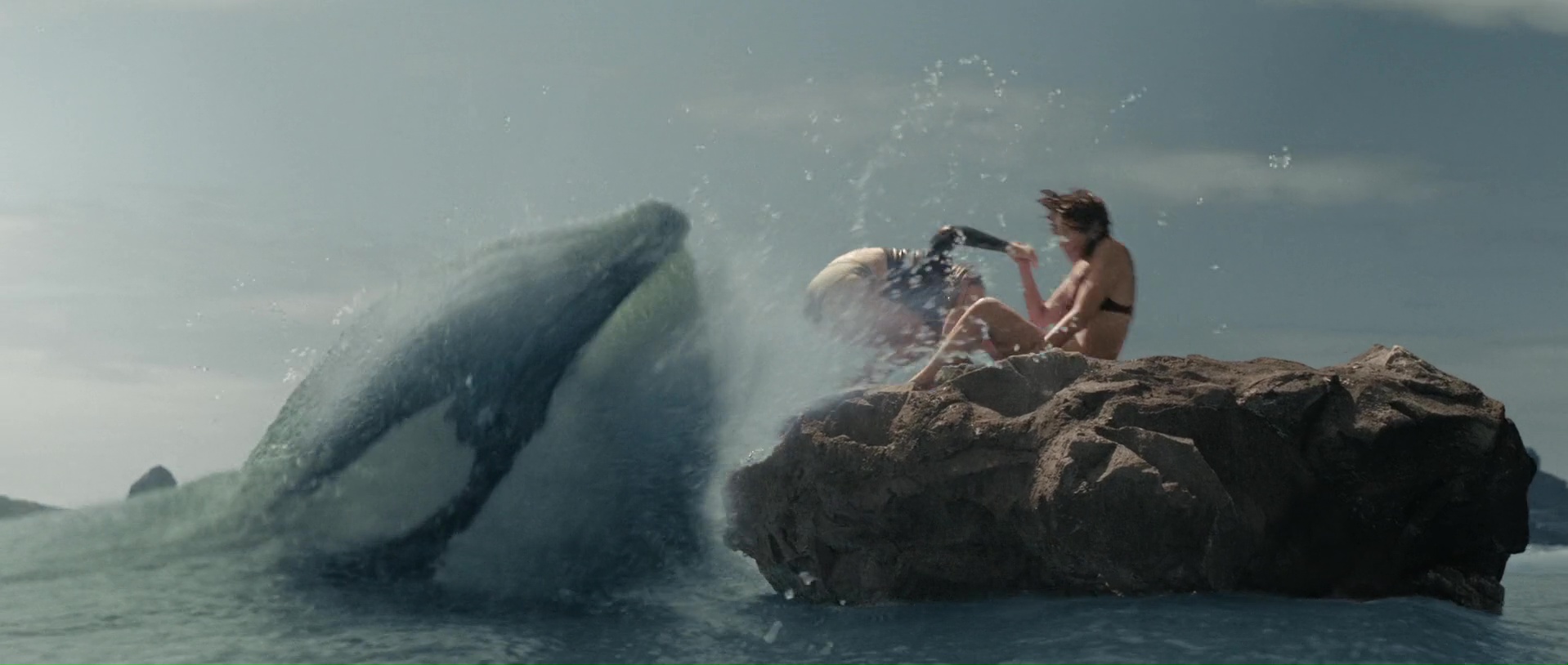 Et le reste donc, la partie en mer façon The Shallows ? Et bien c’est comme The Shallows, avec deux personnages au lieu d’un (plot twist, il y aura des tensions et un personnage va périr), perdues sur un rocher, et c’est sacrément moins bien, la faute à des clichés beaucoup trop prévisibles, à des fonds verts parfois assez voyants voire bien ratés (si bien que parfois, on a presque l’impression que la plage n’est pas si loin), et pas mal d’ennui par moment. L’orque parfois reste relativement bien faite ceci dit, suivant les plans, et ses attaques ou tentatives sont assez fréquentes, heureusement. Et c’est dommage, car à quelques rares occasions, le film a quelques idées, ou du moins des petits élans pour certains plans, comme celui inspirant l’une des pochettes du film, avec un SOS sur un petit bout de plage qui se remplit doucement par le sang d’une victime. Mais ce n’est pas assez pour passionner, surtout qu’au final, les rebondissements et autres dilemmes sont assez peu nombreux pour maintenir le suspense sur la durée. D’ailleurs, son final, là où le film doit tout donner, où l’héroïne doit normalement se surpasser pour survivre, pour dompter la nature, il en est dénué, de suspense. Alors oui, peut-être que pour les quelques couacs visuels, Jo-Anne Brechin n’a pas eu le budget de ses ambitions, le budget de faire mieux. On le pardonnerait ça, si le scénario n’avait pas lui tous ces défauts facilement évitables et corrigeables. On se demande du coup si Lionsgate a regardé le film avant de l’acheter, où a juste vu la pochette et a foncé.