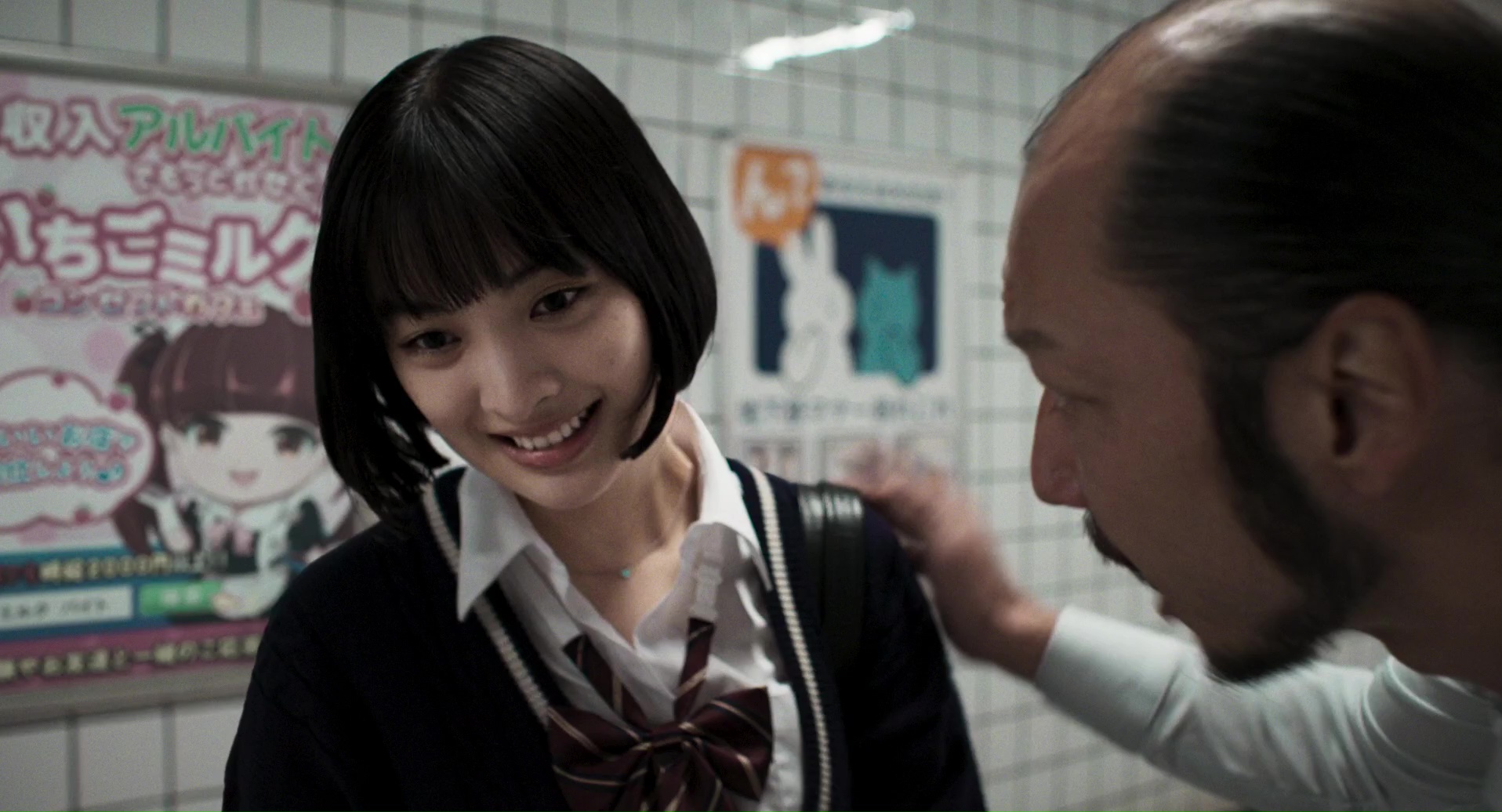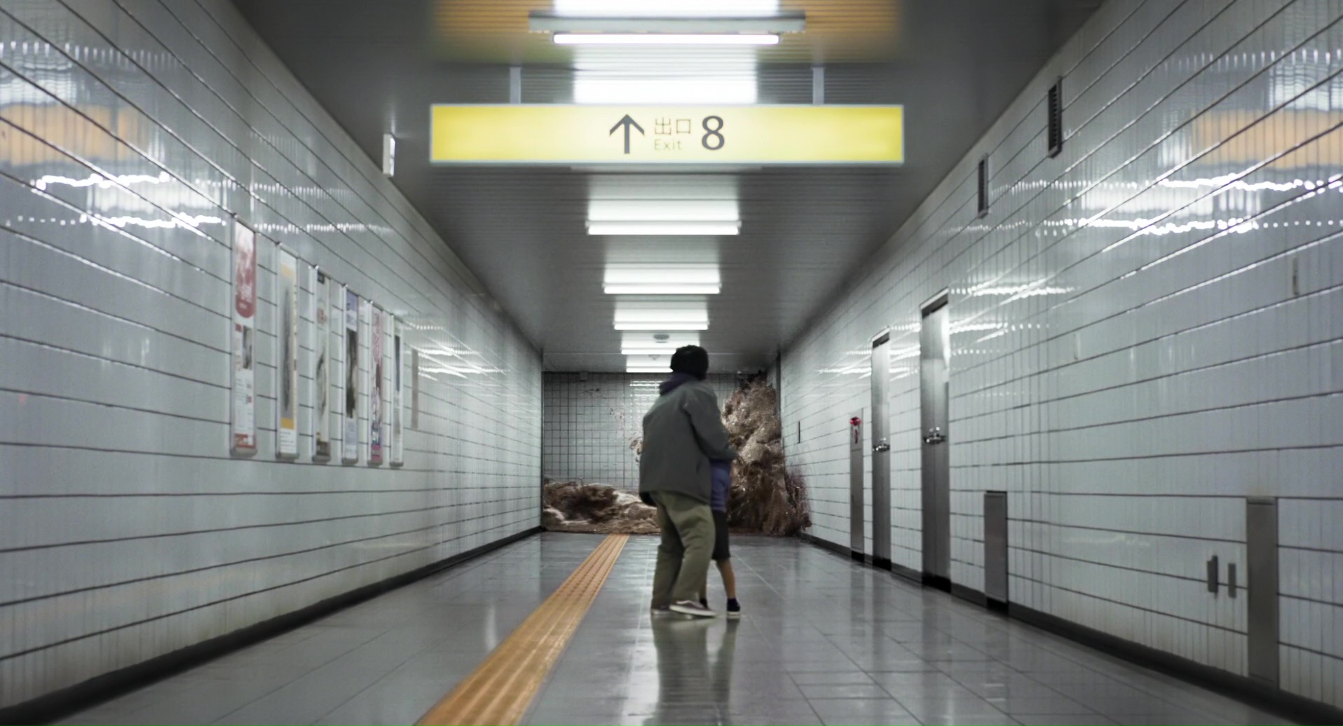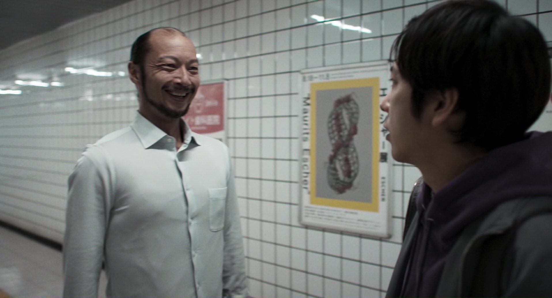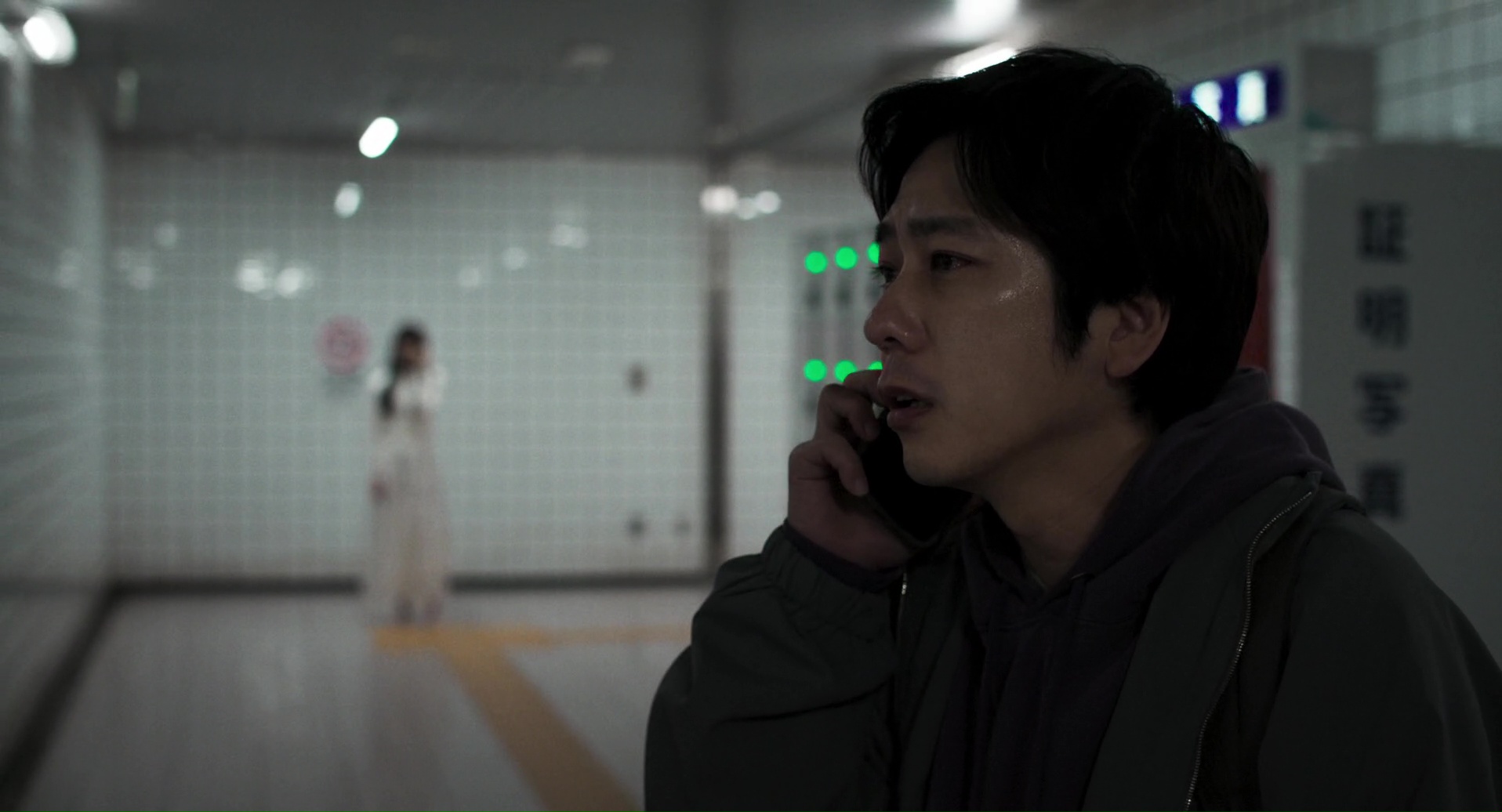 Avec ses 1h35 seulement au compteur, Exit 8 nous propose de suivre un homme, simple, qui prend le train pour rentrer chez lui, et va se retrouver tout simplement dans une boucle, un couloir de gare sans fin, où il va devoir trouver les anomalies, ces éléments qui sortent de l’ordinaire, afin de trouver la sortie, sous peine de passer l’éternité dans ce couloir. D’entrée de jeu, on se rend compte d’une chose bien spécifique, c’est qu’Exit 8 est parvenu à faire très jeu vidéo, tout en développant suffisamment ce qui entoure son concept pour être un film. Du côté jeu vidéo, l’on retrouve une ouverture et une fermeture en vue FPS, le respect du concept même des anomalies à trouver, la reproduction à l’identique du couloir du jeu vidéo en studio, et même une certaine non interactivité entre personnages et décors, puisque dans le jeu, on ne peut que marcher et courir, sans jamais toucher quoi que ce soit. Juste la possibilité d’avancer dans un sens, ou dans l’autre. Et tout cela, le film le respecte. Dans le même ordre d’idées, en plus de scènes en vue subjective comme pour le jeu, le film essaye de rester à hauteur de ses personnages, filmant le tout avec une alternance entre vue à la troisième personne et de longs plans séquences. Pour le coup, il y a donc une réelle volonté de ne rien dénaturer, sans pour autant livrer un simple copier-coller, sinon le film durerait simplement 20 minutes, et ne serait juste pas intéressant à regarder du tout. Le film se permet en effet de multiplier les points de vue avec d’autres personnages, et bien entendu, il ajoute tout un background au personnage principal, pour ne pas en faire une simple coquille vide qui déambule, l’avatar du joueur en quelque sorte. Et c’est Ninomiya Kazunari qui récolte le rôle principal, lui qui se dit fan du jeu, et se serait d’ailleurs fortement investi dans le projet dès son écriture. Et parfois, on se dit que c’est logique, surtout avec un concept aussi minimaliste qu’un seul homme tournant un rond dans un couloir qui est une boucle.