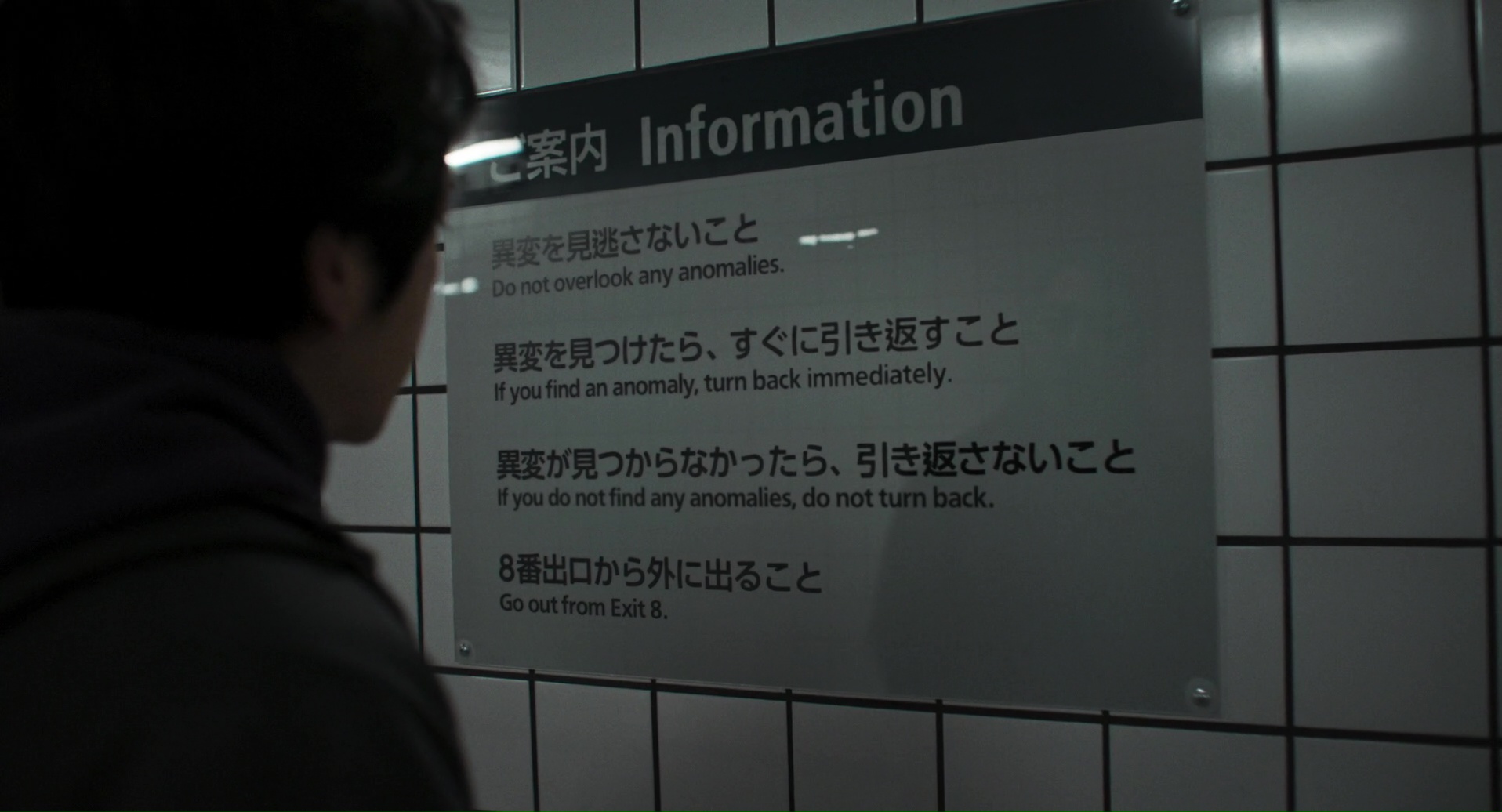 Synopsis : Un homme piégé dans un couloir de métro cherche la sortie numéro 8. Pour la trouver, il faut traquer les anomalies. S’il en voit une, il fait demi-tour. S’il n’en voit aucune, il continue. S’il se trompe, il est renvoyé à son point de départ. Parviendra-t-il à sortir de ce couloir sans fin ?