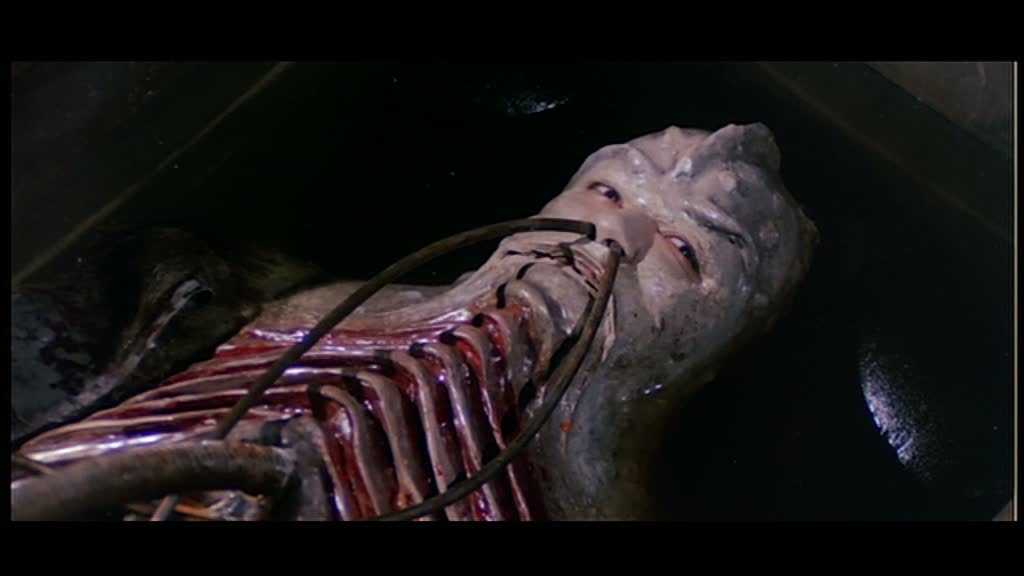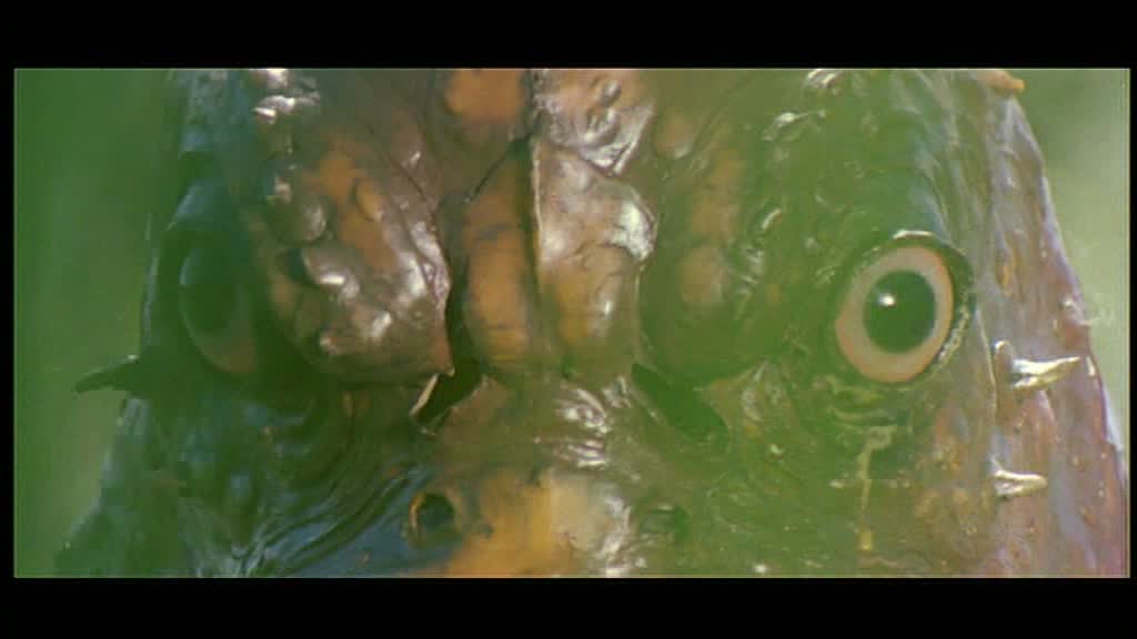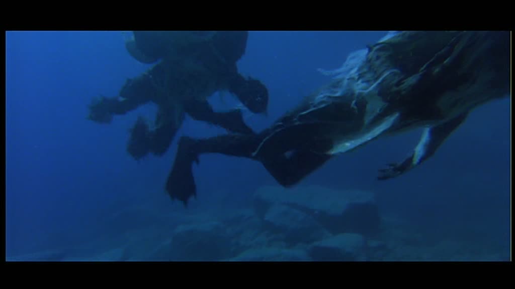 Oui, car même quand l’argent manque, Martino reste un réalisateur honnête et surtout un honnête artisan, qui sait gérer son rythme et son récit. C’est ainsi qu’il y a 10 ans, même vierge du cinéma de Martino, et bien arrivé au terme de la première demi-heure, plusieurs évidences m’arrivèrent au visage. Le Continent des Hommes Poissons n’était pas un nanar, il était différent, et axait son récit juste là où je ne l’attendais pas, là où son titre ne me laissait pas imaginer qu’il irait. Pas un nanar, même s’il flirte oui plusieurs fois avec le genre. Sergio Martino a réalisé son film avec le plus grand des sérieux et cela s’en ressent, il nous livre d’ailleurs par moment de très beaux plans bien trouvés. Oui, Barbara Bach est très séduisante. Oui, le film joue sur le mystère et le fait plutôt bien, et s’avère la majeure partie du temps plus un film d’aventure, avec indigènes, île perdue et inconnue qu’un film de monstres géants qui vont tuer des humains. Et c’est bien de là que viendra le principal souci du métrage. C’est-à-dire les monstres en eux-mêmes. L’histoire se tient, on a envie de croire en cette expérience visant à changer les hommes pour leur permettre de vivre sous l’eau, seulement dés qu’ils sont à l’écran, ça tombe à l’eau (oui, blague facile !). Les costumes sont d’un kitch, avec leurs grands yeux, et l’aspect acteur en costumes, que le métrage perd alors toute crédibilité. Et c’est dommage, puisque même si au final, les hommes poissons ne sont pas présents tout le long du film, ils sont au centre du récit. Nous serons malgré tout encore loin de ce qu’un Bruno Mattei fera des années plus tard avec un design similaire, sur son fameux Terminator 2, ou plutôt Shocking Dark.
