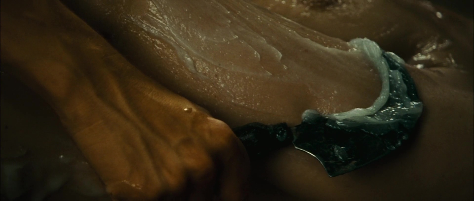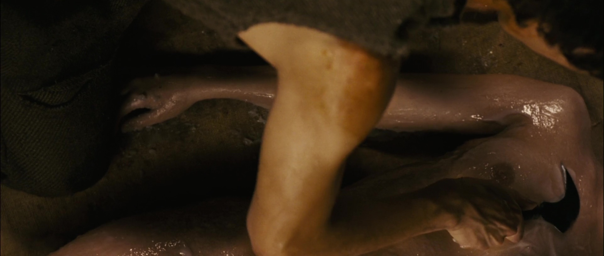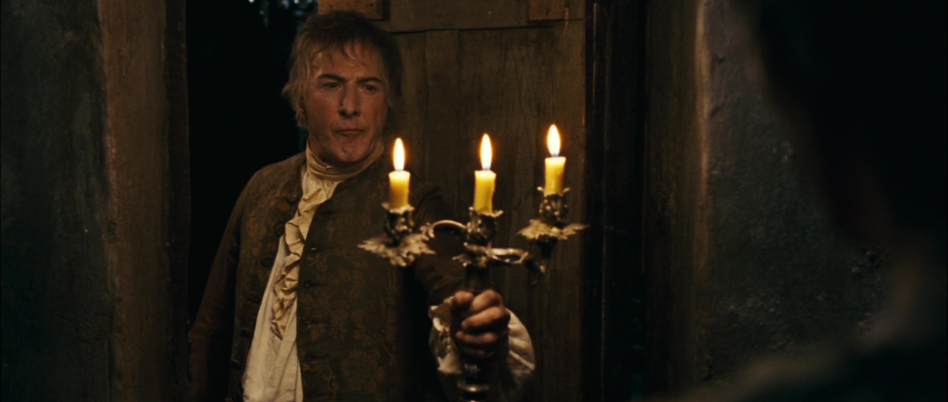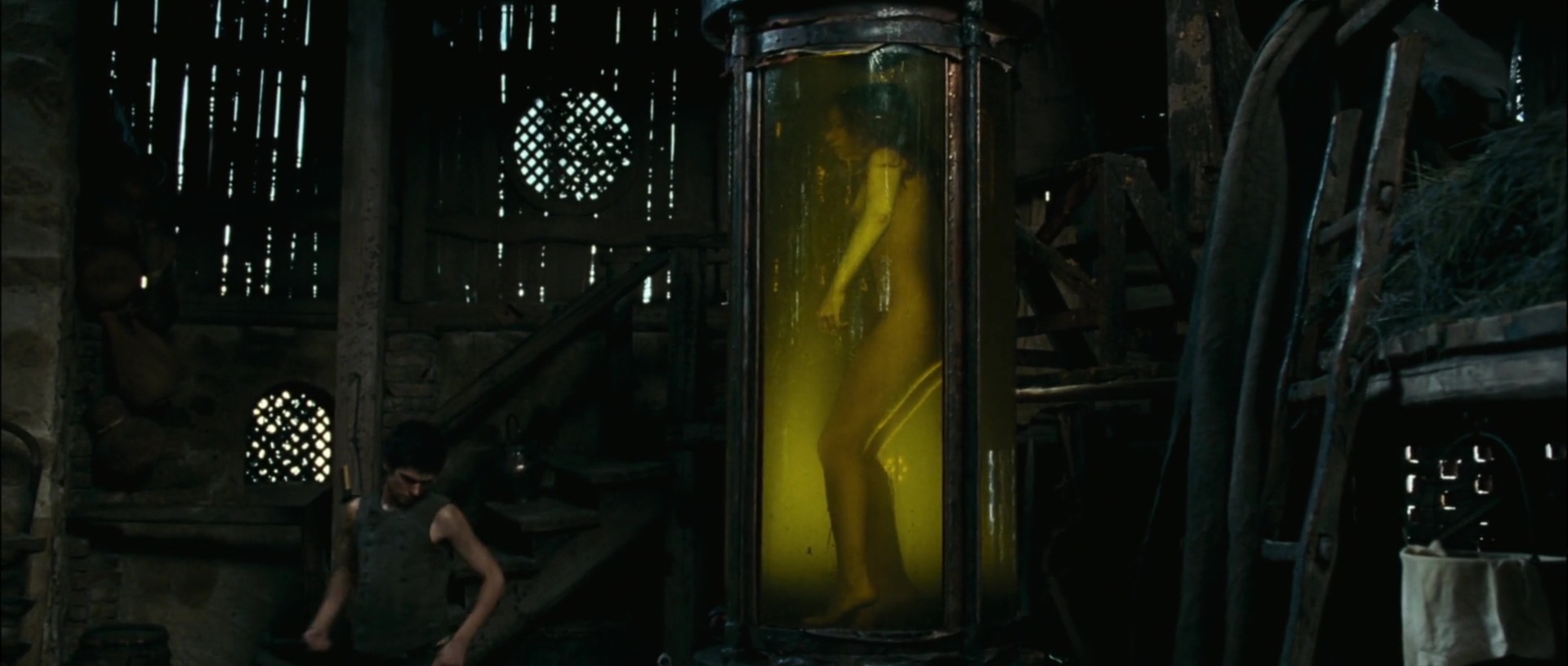 Et Le Parfum donc, c’est très bien, voire excellent. Bon, certaines critiques à l’époque avaient trouvé ça, je cite, « d’une laideur et d’une bêtise assez rares », « adaptation malodorante », « Manque de saveur », « trop long, souffre d’une mise en scène stéréotypée, répétitive »… Oui, autant dire qu’en France, le film n’avait pas eu droit à un bel accueil, à part de quelques revues de bon goût comme L’Ecran Fantastique ou Mad Movies. Il faut dire donc que le métrage part avec quelques handicaps, et qu’en étant en prime une adaptation plutôt fidèle du roman, malgré quelques raccourcis nécessaires, il part au fur et à mesure de son intrigue vers un grotesque assumé qui peut ne pas plaire à tout le monde. Ses handicaps en tout cas, ils sont évidents. Comment retranscrire en film, à l’aide d’images et de sons donc, une histoire tournant autour des odeurs ? Car notre héros, ou anti-héros plutôt, Jean-Baptiste, a un don, et ce n’est pas celui d’être étrange et peu bavard, ou de devenir Q chez James Bond quelques années plus tard, mais on parle bien de son odorat ultra développé. Ce qui, malgré un début de vie de misère totale, va l’amener sur le chemin de parfumeurs, qui, bien conscients des talents du jeune homme, vont le prendre sous leurs ailes. Au départ, ce sera un Dustin Hoffman toujours aussi bon à l’écran, pour une première partie se déroulant à Paris, avant que l’intrigue ne délocalise au Sud, à Grasse, où le destin mettra sur la route funeste du héros la présence d’une jolie Rousse et de son père joué par feu Alan Rickman. En réalité d’ailleurs, plus que d’odeurs, même si le film parvient à mon sens parfaitement à donner une impression putride (il suffit de voir l’ouverture), rien qu’avec les images, Le Parfum parle plutôt de l’obsession autour des odeurs. Car Jean-Baptiste, obscédé par le concept de conserver les odeurs, et donc, des parfums, va vouloir extraire en utilisant divers procédés l’odeur corporelle de femmes.