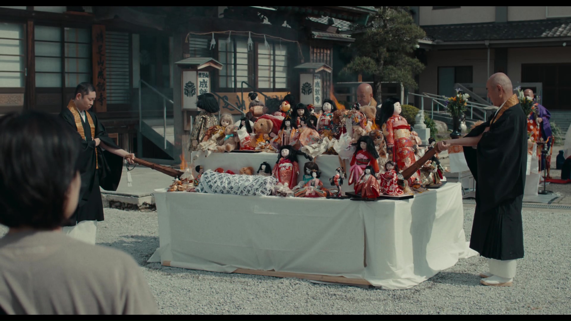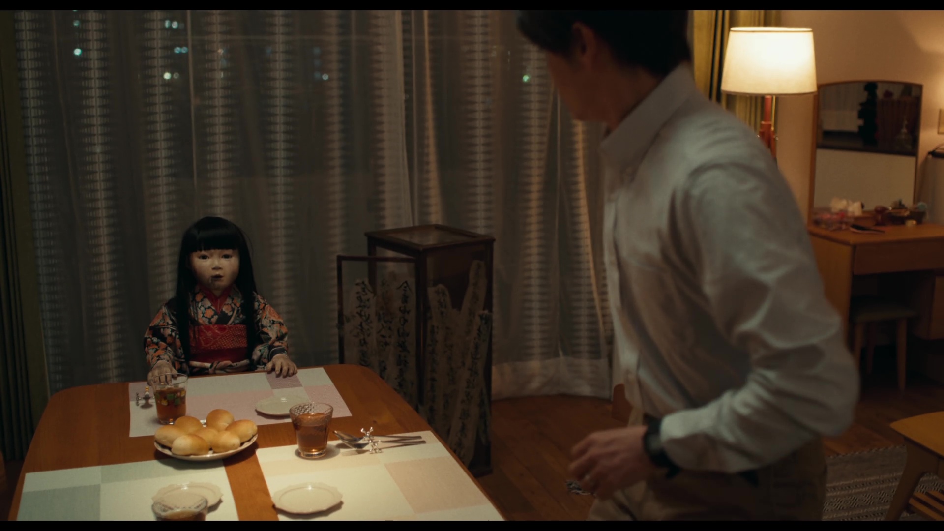 On pourra même dire sans trop forcer que la plupart de ses ressorts horrifiques, ils sont eux aussi peu originaux, déjà vu ailleurs. Mais purée, ça fonctionne. Déjà car Yaguchi, en faisant un film de genre, ne se contente pas seulement de placer jumpscares après jumpscares, d’ailleurs peu nombreux, mais écrit une vraie histoire, avec de vrais personnages travaillés, et surtout, met en place des thématiques lourdes. Le deuil notamment, évidemment, puisque Yoshie (Nagasawa Masami, vue dans I am a Hero ou encore Shin Ultraman), l’héroïne de notre film, et son mari, Tadahiko (Seto Koji, vu déjà chez Shimizu et chez Nakata, mais aussi dans l’univers étendu des films de Nakata avec les affreux Sadako 3D 1 et 2), perdent dès le début leur petite fille, et vont avoir bien du mal à s’en remettre, surtout Yoshie. Jusqu’au jour où elle va tomber sur une poupée et l’acheter. Avant même de faire débarquer l’horreur pure et dure dans le récit, le réalisateur place donc déjà une horreur réaliste (la perte de son enfant, dans une scène d’ouverture au final aussi magnifiquement réalisée que simpliste dans les faits) et des thèmes intéressants, comme la thérapie après cet événement par une poupée, que Yoshie adoptera en se comportant comme une mère envers la poupée. De quoi surmonter donc ses traumas. Mais lorsque le couple, qui retrouve enfin un peu de joie de vivre, voit un nouvel enfant naître, la poupée perd son utilité. Et elle ne l’entend pas forcément de cet œil-là. Et Dollhouse, la majeure partie du temps, est un film rondement mené, suggérant beaucoup avec peu de choses, et jouant avec tout ce que le genre a apporté pour être sûr de fonctionner sur l’amateur. Si bien qu’il y aura bien, même pour les plus gros consommateurs du genre, une ou deux bonnes surprises dans le métrage (pour moi, ce fut le premier retour de la poupée et ce mouvement de caméra habile révélant le grand tableau de la scène). Mieux encore, là aussi niveau horreur, le métrage abordera certains sujets assez rares au cinéma, et donc peu connus hors du Japon, comme cette cérémonie de crémation pour les poupées, comme un ultime signe de respect envers ses êtres inanimés qui ont partagé notre vie à un moment ou à un autre.