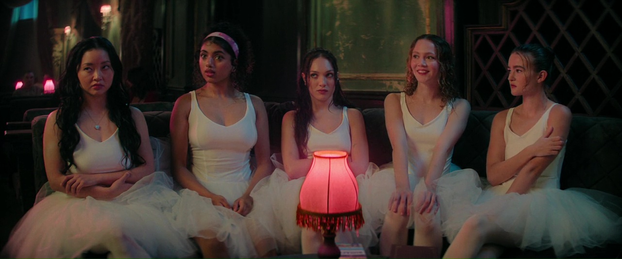 Au départ annoncé en 2023, Pretty Lethal, au départ appelé Ballerina Overdrive, a prit du temps avant de se concrétiser, à tel point qu’il a depuis changé de titre donc, mais aussi de casting. Qu’importe, le métrage fut tourné à partir de l’été 2024 et ce jusqu’à la fin de l’année, à Budapest, avant de rester un an dans les cartons, et de débarquer sur Amazon Prime fin Mars 2026. Et si dans le fond, on reste dans l’action, rien à voir avec le film Ballerina ceci dit, puisqu’ici, ce sont cinq danseuses qui se rendent à un spectacle mais qui débarquent dans un bar mafieux suite à quelques soucis de voiture. Témoins d’un meurtre, elles sont séquestrées, et vont décider de ne pas se laisser faire. 1h28 au compteur, dont un générique de fin à rallonge, une scénariste qui est une ancienne ballerine et donc peut amener un certain réalisme, une réalisatrice dont le film le mieux noté jusque là était Close (avec Noomi Rapace et Sophie Nélisse), et un titre Français qui sonne comme une vieille série Z plus tard, j’ai donc vu Pirouette Fatale (non, on retournera sur Pretty Lethal), et si ça ne restera assurément pas dans les mémoires (comme beaucoup de films Amazon Prime, ou Netflix, ou Disney +), ce n’était pas non plus mauvais, et au final, j’ai passé un bon petit moment devant le métrage. Un métrage qui ne brille aucunement par son scénario, basique au possible et au final, dont on se contre-fiche totalement puisqu’une fois les ballerines dans le bar, c’est juste de la survie et point barre. Mais qui ne brille pas non plus par ses personnages, où chacun n’aura au final qu’une seule caractéristique pour tenter non pas de leur donner de l’épaisseur, mais juste de donner un groupe de personnages variés, entre la sourde (Millicent Simmonds, vue dans Sans un Bruit), celle qui ne pense qu’à elle (Lana Condor, d’origine Vietnamienne), et bien entendu, l’héroïne qui veut sauver tout le monde et sera la première à rendre les coups.