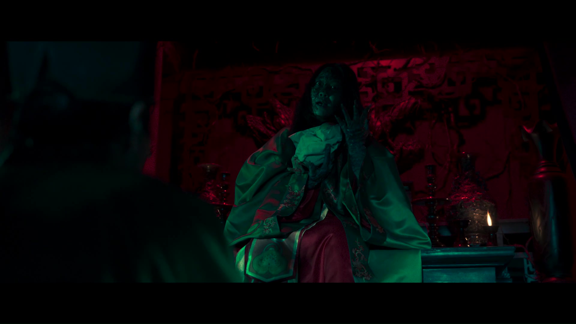 Là où le métrage aurait en réalité gagné à se focaliser quasi exclusivement sur Nhai qui doit faire face à cette malédiction familiale qui lui tombe littéralement sur la gueule, le métrage s’éparpille souvent autour des autres membres de la famille, que ce soit le père en parti à l’origine de la malédiction, le mari, ou même le frère du mari. Jamais cela ne fait du métrage un mauvais film, mais cela parfois retire de l’impact à certains événements, trop dilués dans le reste. Autre défaut, et pas des moindres, si Le-Van Kiet s’est clairement amélioré dans sa représentation de l’horreur, un poil moins frontale et donc risible, il nous sort en réalité assez souvent la petite encyclopédie du genre. Alors oui, on aura quelques jumpscares, des esprits en arrière-plan flous, des plans bien plus viscéraux, une malédiction, du folklore, sans oublier la bande son inquiétante à base d’instruments à cordes bien stridents et les éclairages colorés pour quelques scènes de rites. Encore une fois, il maitrise pour une fois plutôt bien les différents aspects du métrage, en évitant d’en faire des caisses (quoi que, par moment), mais il donne là aussi l’impression de s’éparpiller parfois un poil trop, de réciter toutes les techniques possibles avec application, mais sans originalité. Il y a 15 ans, cela aurait sans doute un poil moins dérangé, mais en 2025, et maintenant 2026, s’il reste un métrage dépaysant par ses rites, ses coutumes et sa langue, il surprend moins. Il a sans doute également un peu moins d’impact. Mais il reste, oui, un métrage solide et divertissant, joliment filmé, et donc un petit miracle dans la filmographie de son réalisateur. Maintenant, un poil plus de sobriété, surtout dans le final, et un bon 15 voire 20 minutes en moins, et Bride of the Covenant aurait pu être véritablement excellent.