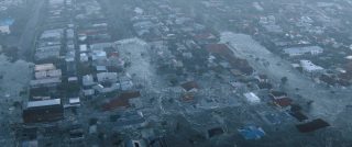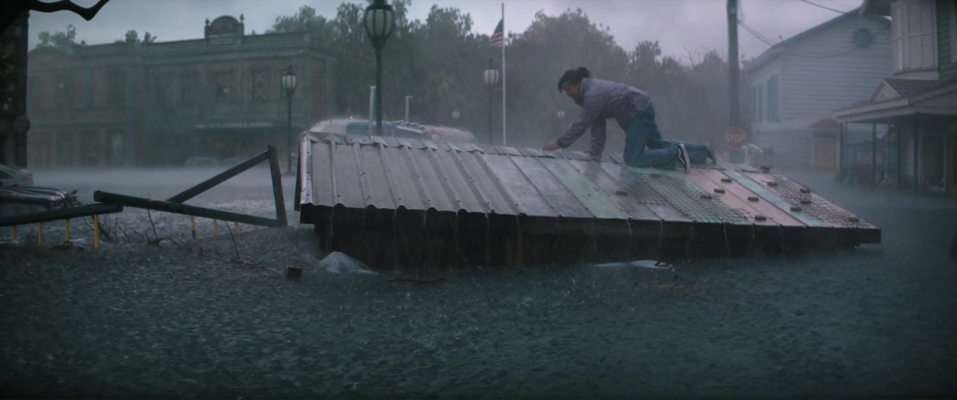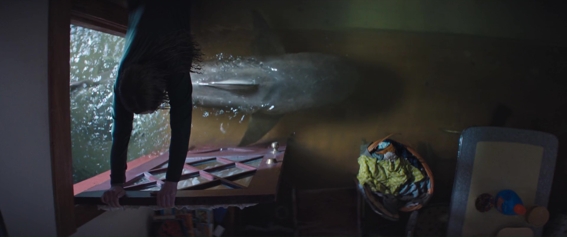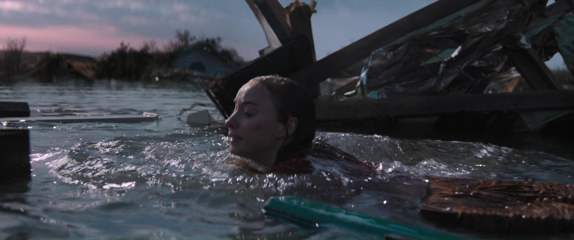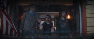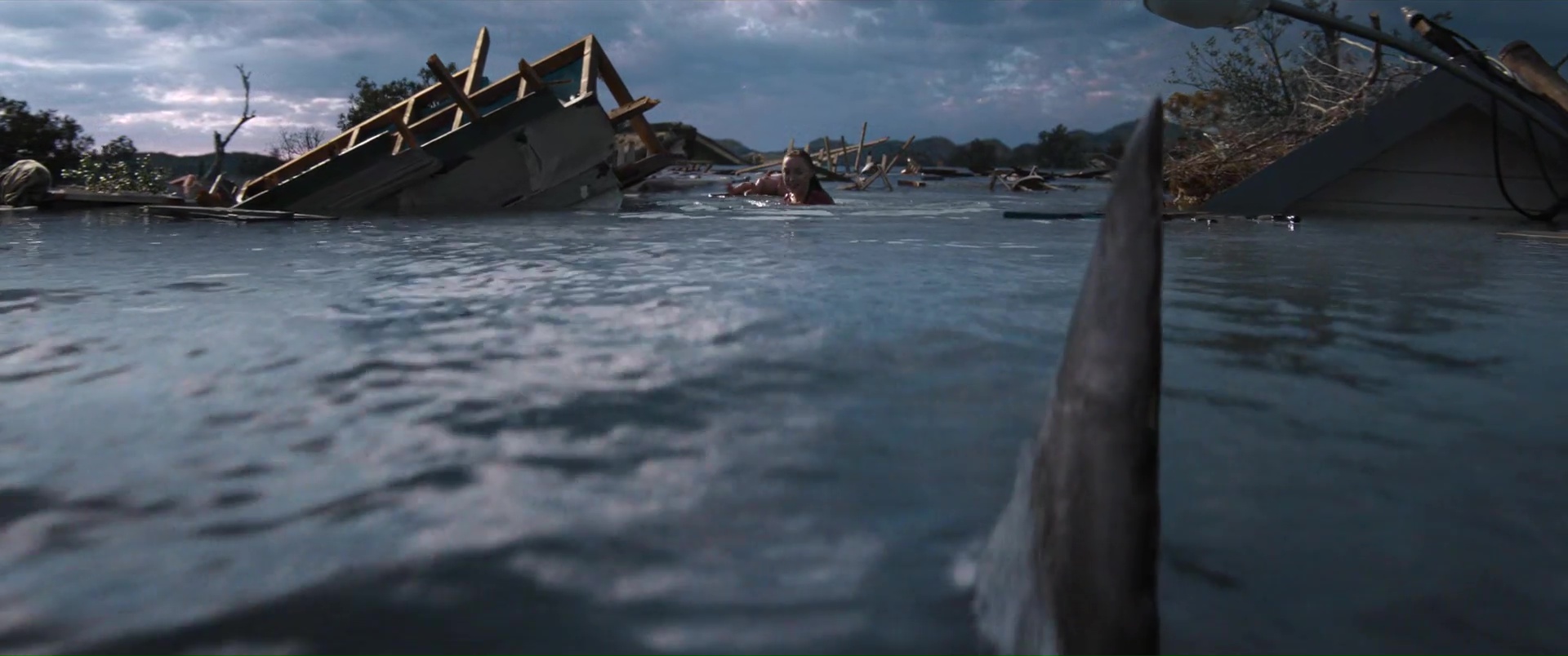 Ce qui est plutôt dommage, pour un film à suspense. Ici donc, encore un ouragan, une ville qui se retrouve submergée, et une poignée de personnages qui vont devoir survivre à la nature, encore plus que les eaux qui montent amènent des requins marteaux dans l’équation. Au menu ? Une jeune femme enceinte qui se retrouve bloquée dans sa voiture (Phoebe Dynevor), une jeune femme qui a limite peur de sortir de chez elle depuis la mort de ses parents (Whitney Peak), trois enfants qui ont la joie de vivre dans une famille d’accueil détestable et manipulatrice, et au loin, Djimon Hounsou qui va tenter pendant tout le film de rejoindre ce bordel, car sa nièce est dans les personnages déjà cités. Rien de bien neuf au niveau des personnages donc, tout comme des situations, puisque l’on retrouvera les personnages secondaires là juste pour se faire bouffer, dans certaines situations rappelant encore une fois Crawl d’Alexandre Aja, le personnage bloqué avec l’eau qui monte, et une aide qui ne viendra pas, forçant les personnages à revoir leur instinct de survie à la hausse. Le film ne brille pas par son scénario, ni par ses situations, et pour le coup, Tommy Wirkola, qui signe seul le script, n’a pas dû bien se fouler. Là où c’est bien plus problématique en réalité, c’est que toutes ces situations et personnages clichés pourraient malgré tout fonctionner. Crawl n’était par exemple pas non plus un modèle d’écriture. Mais il savait gérer et étirer son suspense. Sauf qu’ici la tension ne prend jamais véritablement, le film se faisant parfois trop sérieux pour son propre bien, et étonnement parfois pas assez sérieux, là aussi pour son propre bien. Ce qui donne des situations prometteuses parfois éclipsées en 4 secondes et demi, et à d’autres moments des situations traitées par-dessus la jambe, avec ce qui semble être un second degré qui aurait presque peur de s’assumer. Ce qui fait que le métrage s’éparpille au niveau du ton, pouvant enchaîner la séquence un brin risible de l’accouchement (avec playlist zen à la clé), pour un moment sans doute censé être un poil dramatique, et la riposte à base de viande et de dynamite de la part des enfants qui s’annonce fun, mais qui au final, reste anecdotique et éclair.