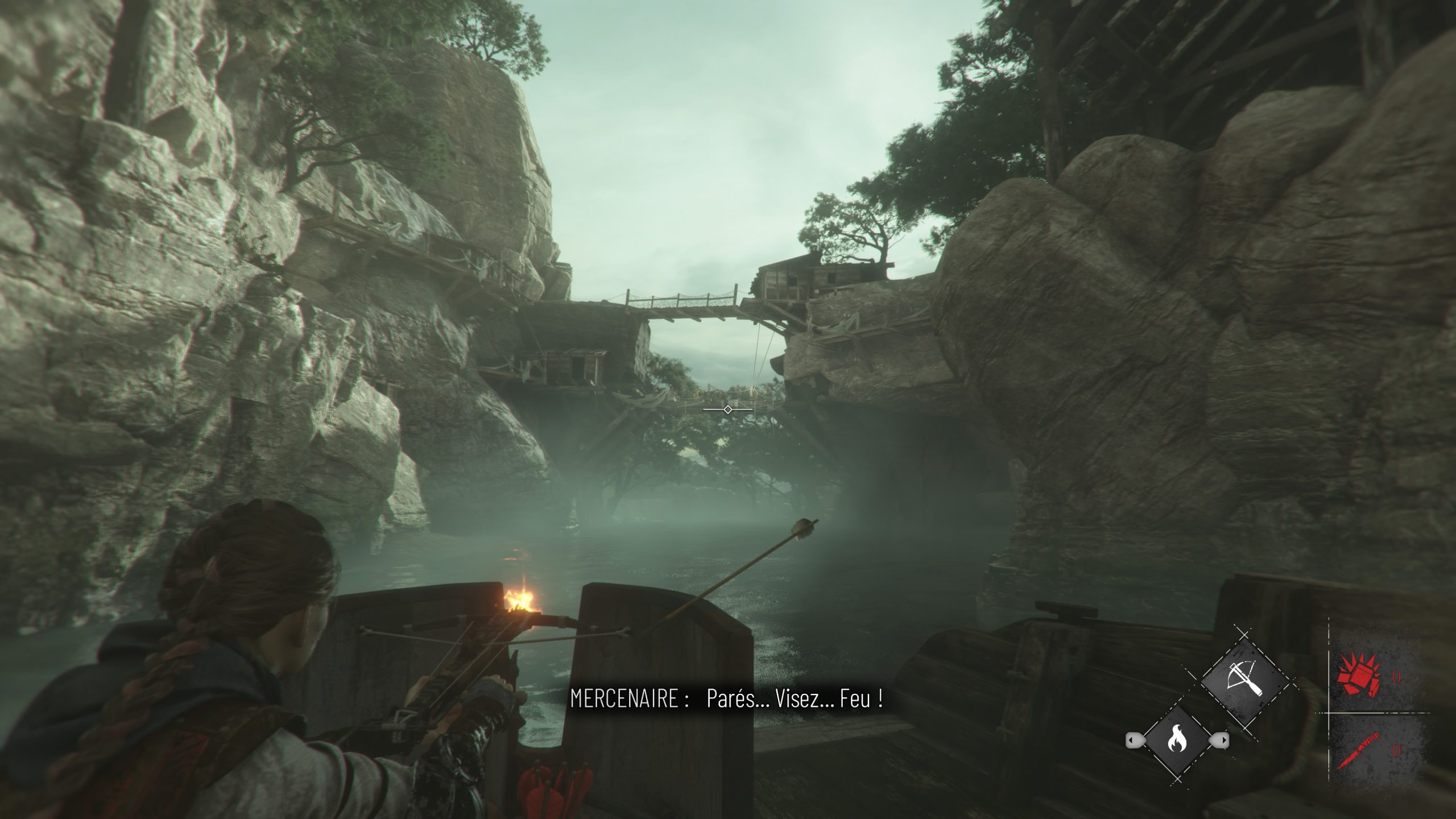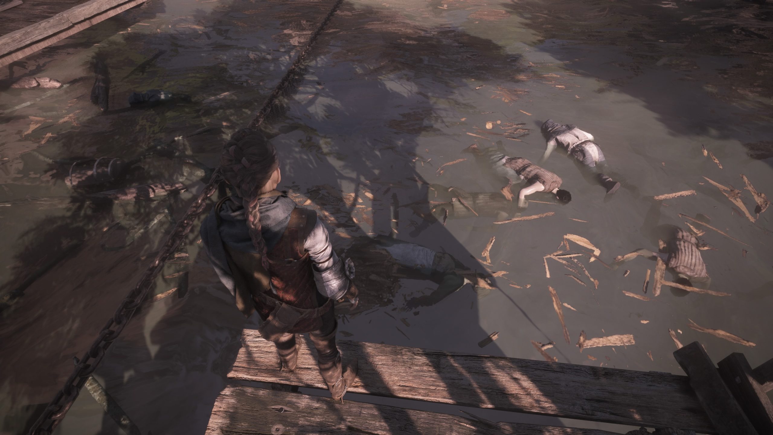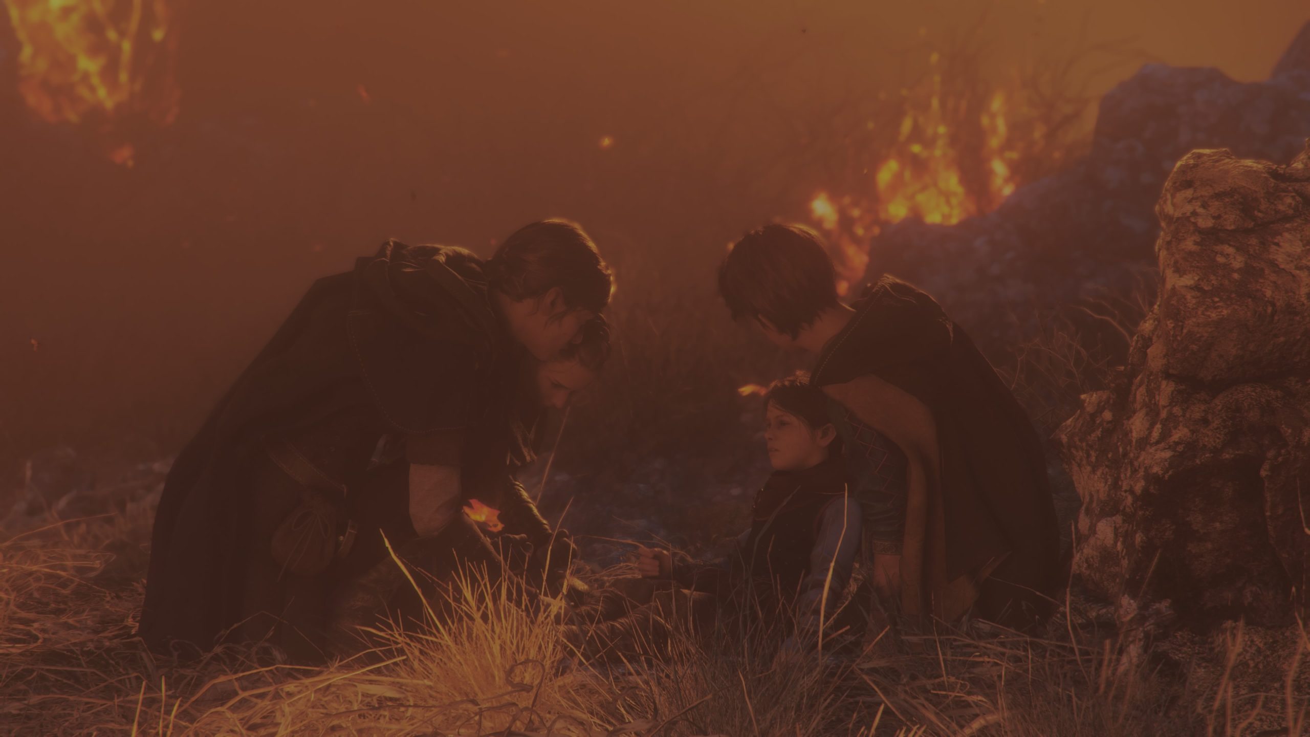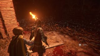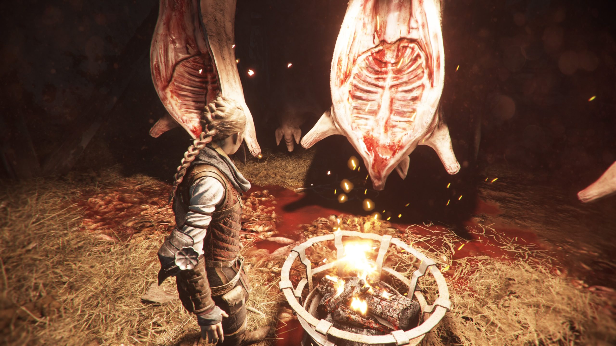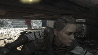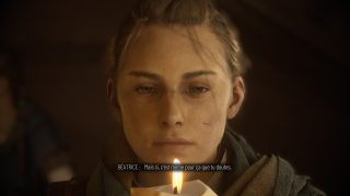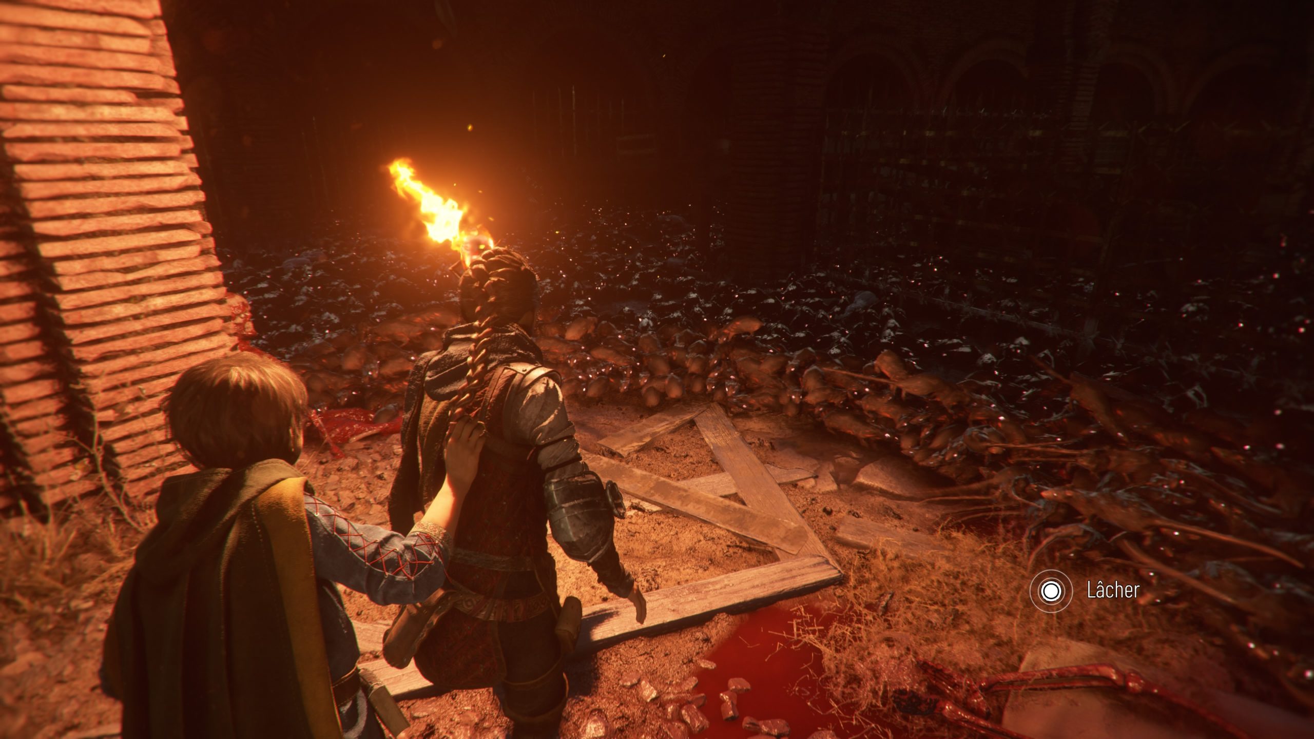 L’intrigue reprend en tout cas six mois après les événements du premier jeu, et nous jouons toujours Amicia, qui va devoir protéger son petit frère Hugo, et traverser 16 chapitres où des soldats, des mercenaires, des rats et j’en passe en auront après leur peau. Il va donc falloir une nouvelle fois se servir de sa fronde, lancer des pierres, être furtif, et utiliser du feu pour se frayer un chemin dans une histoire sombre. Et dès le lancement du jeu, Requiem fait mouche. Connaissant bien le jeu original, la rigidité générale du gameplay ne dérange pas, et le jeu nous met très rapidement à l’épreuve face à des ennemis pour ramener nos réflexes sans avoir à poser ses personnages et son contexte. Hyper efficace, et déjà magnifique pour les yeux, car il y a bien un truc qui est clair dès le début, c’est que le studio maitrise parfaitement son art dans le domaine artistique. Souvent, c’est magnifique pour les yeux, même lorsque l’on doit traverser des fosses pleines de cadavres en décompositions ou des grottes sombres et humides pleines de rats. C’est souvent flatteur pour les yeux, impressionnant et on a carrément impression de traverser ses lieux. Artistiquement, c’est une réussite totale et incontestable, et le framerate reste constant, aujourd’hui en tout cas. L’intrigue, dans ses grandes lignes, est dans la continuité du premier jeu, en un poil plus sombre, et grâce à des personnages attachants, que ce soit ceux que l’on connait déjà (Amicia, Lucas, Hugo, Béatrice) ou les nouveaux venus qui vont nous rejoindre au fur et à mesure (Arnaud, Sophia), ça fonctionne très bien, et ça donne toujours envie d’avancer, de savoir ce qu’il va se passer ensuite, et comment tout cela va se conclure. Le côté plus sombre et plus désespéré de l’intrigue est un petit plus également.